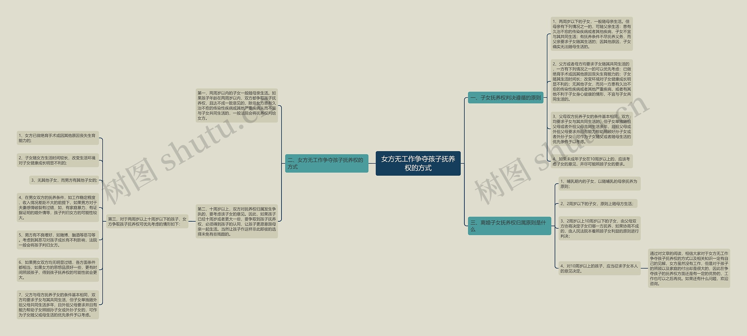树图思维导图提供《女方无工作争夺孩子抚养权的方式》在线思维导图免费制作,点击“编辑”按钮,可对《女方无工作争夺孩子抚养权的方式》进行在线思维导图编辑,本思维导图属于思维导图模板主题,文件编号是:17e511b26ac7523128b414e92e9ea008