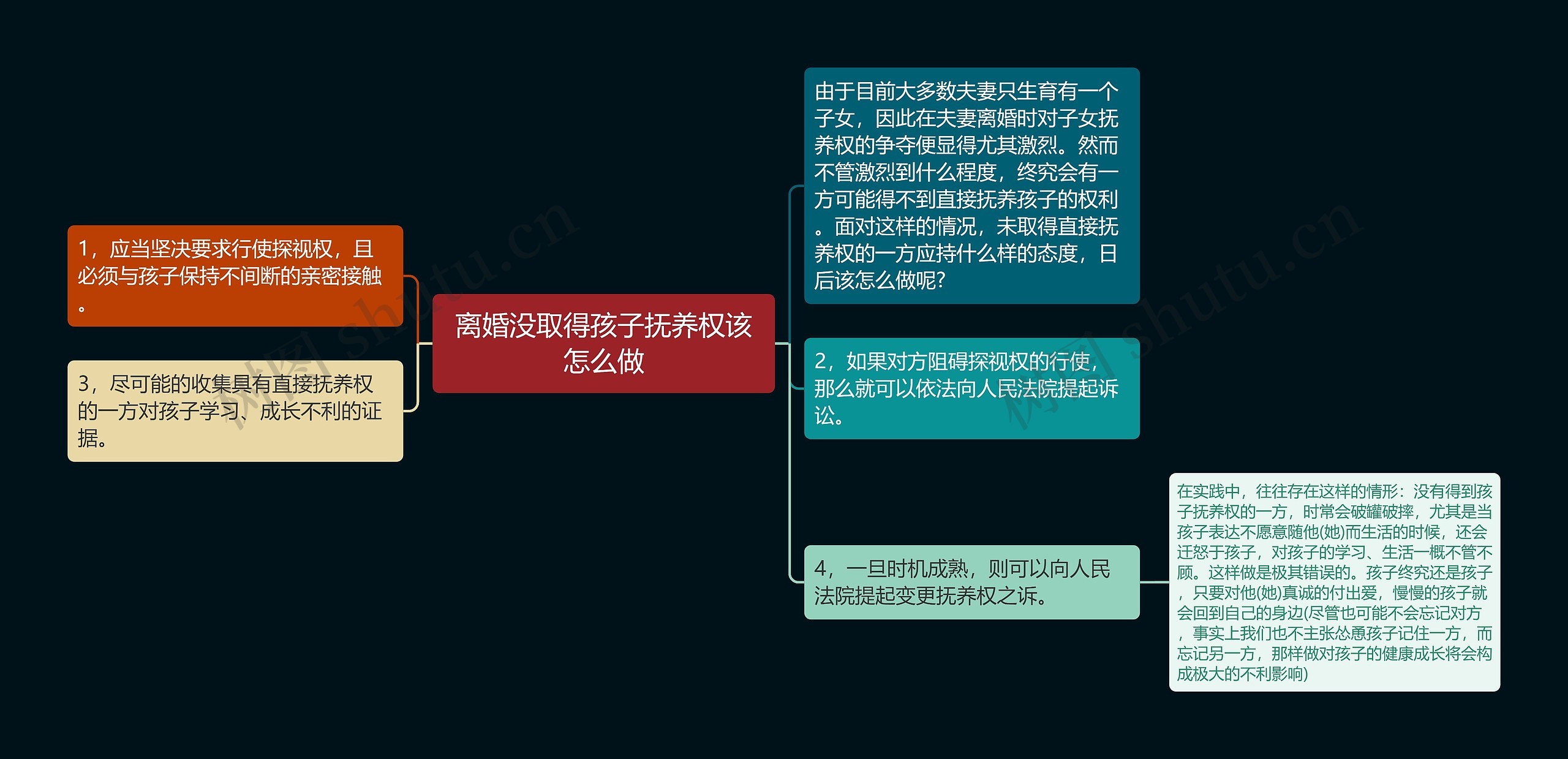 树图思维导图提供《离婚没取得孩子抚养权该怎么做》在线思维导图免费制作,点击“编辑”按钮,可对《离婚没取得孩子抚养权该怎么做》进行在线思维导图编辑,本思维导图属于思维导图模板主题,文件编号是:03c80ef697b2c183e15a2fa5e272f807