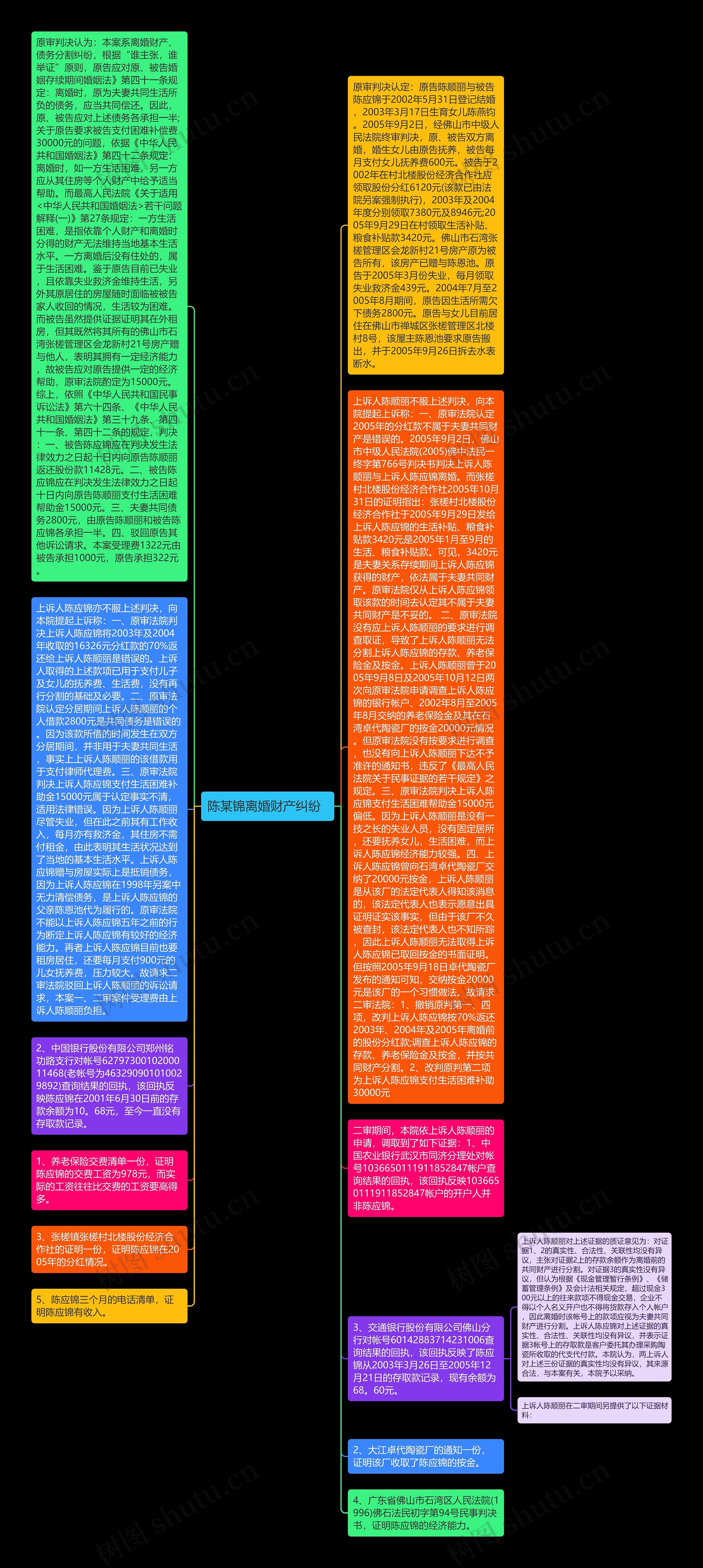上诉人陈顺丽不服上述判决,向本院提起上诉称:一、原审法院认定2005年的分红款不属于夫妻共同财产是错误的。2005年9月2日,佛山市中级人民法院(2005)佛中法民一终字第766号判决书判决上诉人陈顺丽与上诉人陈应锦离婚。而张槎村北楼股份经济合作社2005年10月31日的证明指出:张槎村北楼股份经济合作社于2005年9月29日发给上诉人陈应锦的生活补贴、粮食补贴款3420元是2005年1月至9月的生活、粮食补贴款。可见,3420元是夫妻关系存续期间上诉人陈应锦获得的财产,依法属于夫妻共同财产。原审法院仅从上诉人陈应锦领取该款的时间去认定其不属于夫妻共同财产是不妥的。 二、原审法院没有应上诉人陈顺丽的要求进行调查取证,导致了上诉人陈顺丽无法分割上诉人陈应锦的存款、养老保险金及按金。上诉人陈顺丽曾于2005年9月8日及2005年10月12日两次向原审法院申请调查上诉人陈应锦的银行帐户、2002年8月至2005年8月交纳的养老保险金及其在石湾卓代陶瓷厂的按金20000元情况。但原审法院没有按要求进行调查,也没有向上诉人陈顺丽下达不予准许的通知书,违反了《最高人民法院关于民事证据的若干规定》之规定。三、原审法院判决上诉人陈应锦支付生活困难帮助金15000元偏低。因为上诉人陈顺丽是没有一技之长的失业人员,没有固定居所,还要抚养女儿,生活困难,而上诉人陈应锦经济能力较强。四、上诉人陈应锦曾向石湾卓代陶瓷厂交纳了20000元按金,上诉人陈顺丽是从该厂的法定代表人得知该消息的,该法定代表人也表示愿意出具证明证实该事实,但由于该厂不久被查封,该法定代表人也不知所踪,因此上诉人陈顺丽无法取得上诉人陈应锦已取回按金的书面证明。但按照2005年9月18日卓代陶瓷厂发布的通知可知,交纳按金20000元是该厂的一个习惯做法。故请求二审法院:1、撤销原判第一、四项,改判上诉人陈应锦按70%返还2003年、2004年及2005年离婚前的股份分红款;调查上诉人陈应锦的存款、养老保险金及按金,并按共同财产分割。2、改判原判第二项为上诉人陈应锦支付生活困难补助30000元