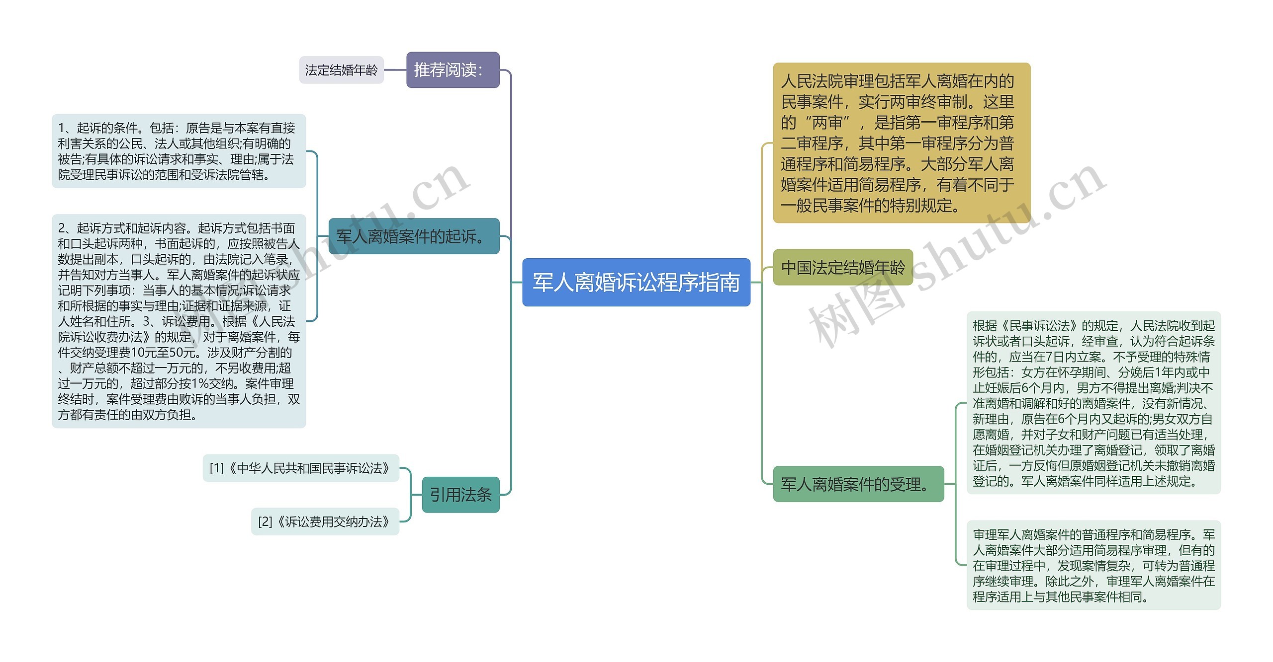 树图思维导图提供《军人离婚诉讼程序指南》在线思维导图免费制作,点击“编辑”按钮,可对《军人离婚诉讼程序指南》进行在线思维导图编辑,本思维导图属于思维导图模板主题,文件编号是:614c0d81a8cbd2546a1c78fed6a5fd61