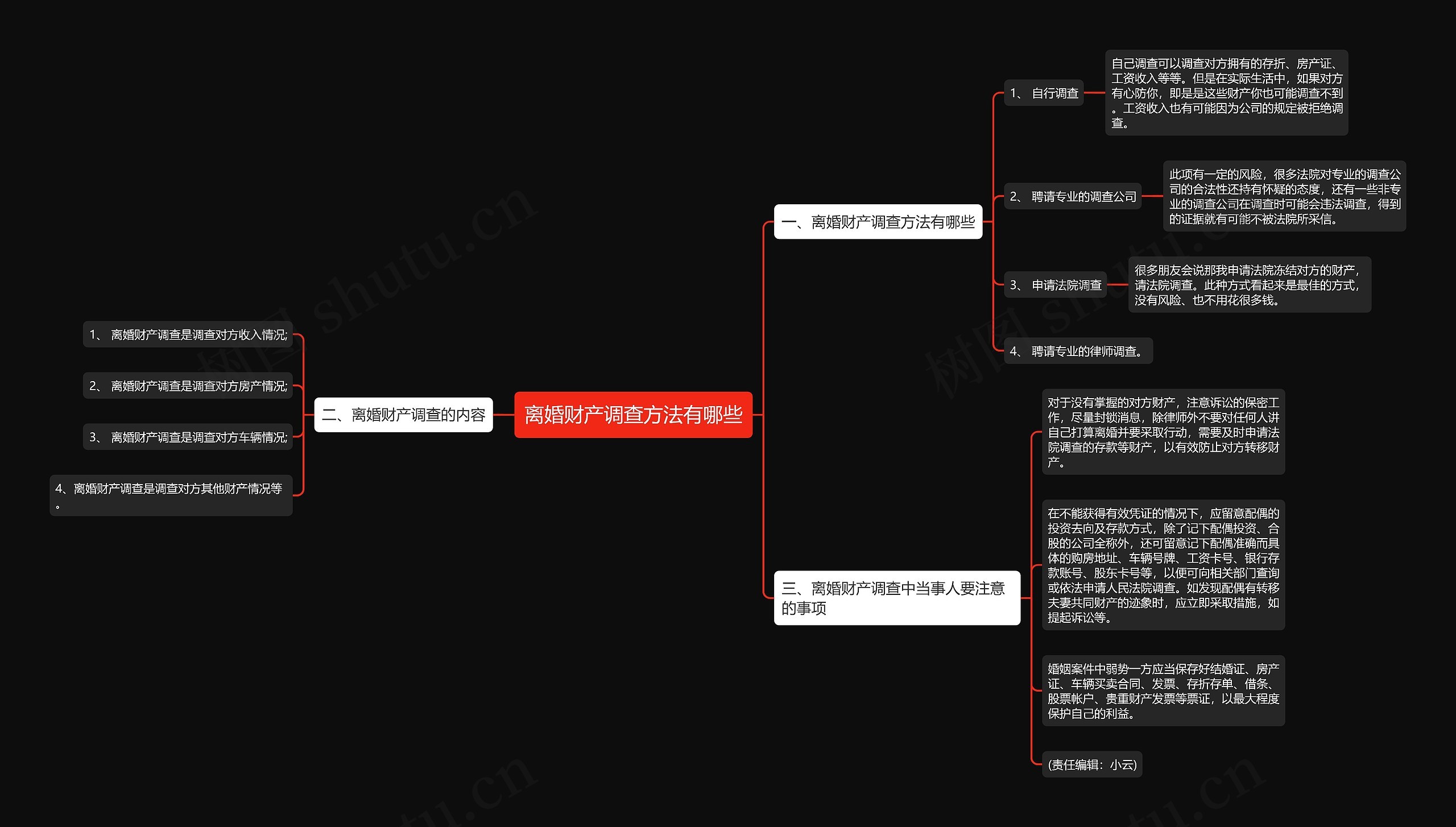 树图思维导图提供《离婚财产调查方法有哪些》在线思维导图免费制作,点击“编辑”按钮,可对《离婚财产调查方法有哪些》进行在线思维导图编辑,本思维导图属于思维导图模板主题,文件编号是:e69e37dde9db6daa3a5fff351d91ae23