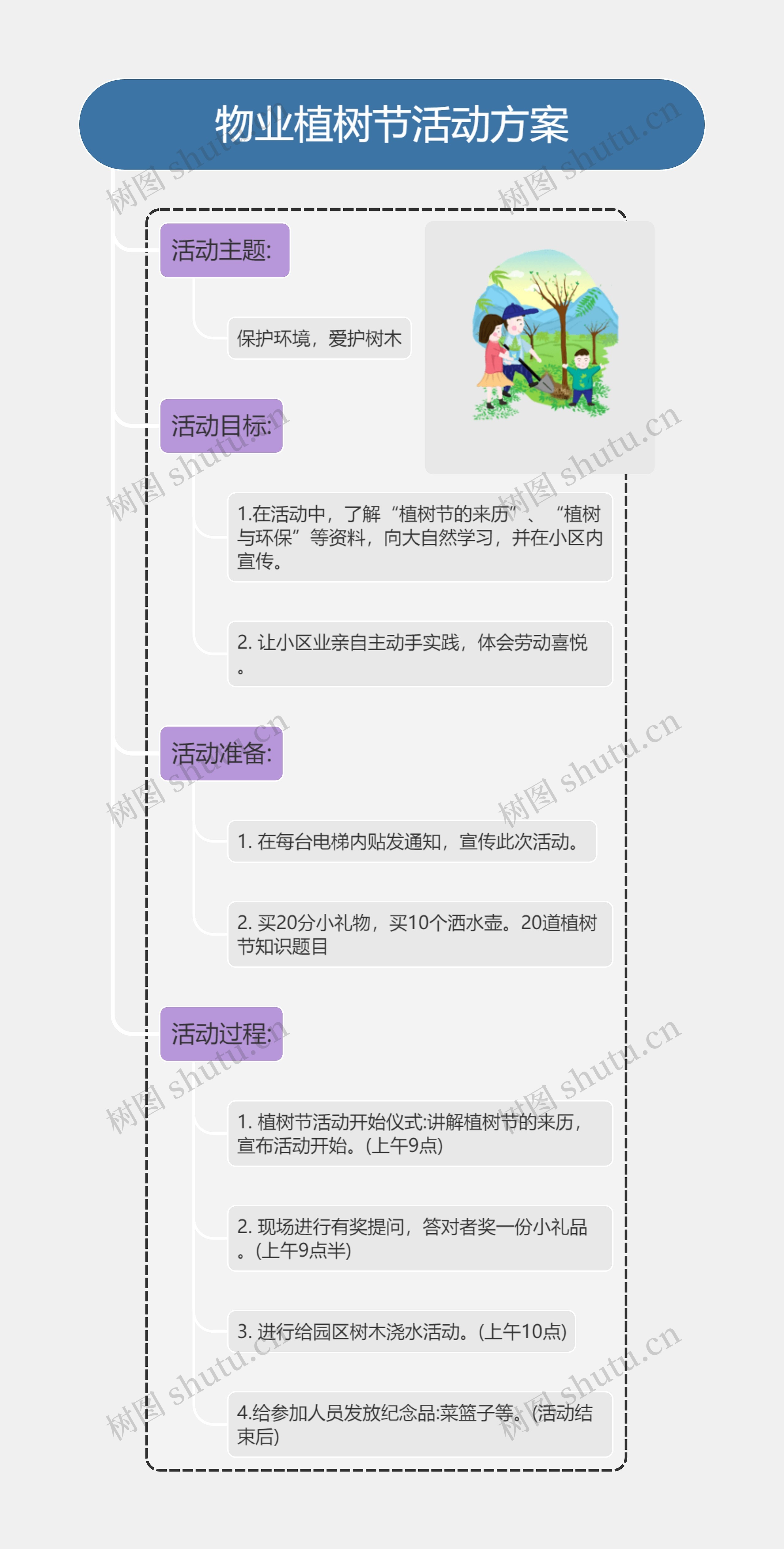 树图思维导图提供《物业植树节活动方案》在线思维导图免费制作,点击“编辑”按钮,可对《物业植树节活动方案》进行在线思维导图编辑,本思维导图属于思维导图模板主题,文件编号是:11a1b6e14d7cba531f4f0107183023b6