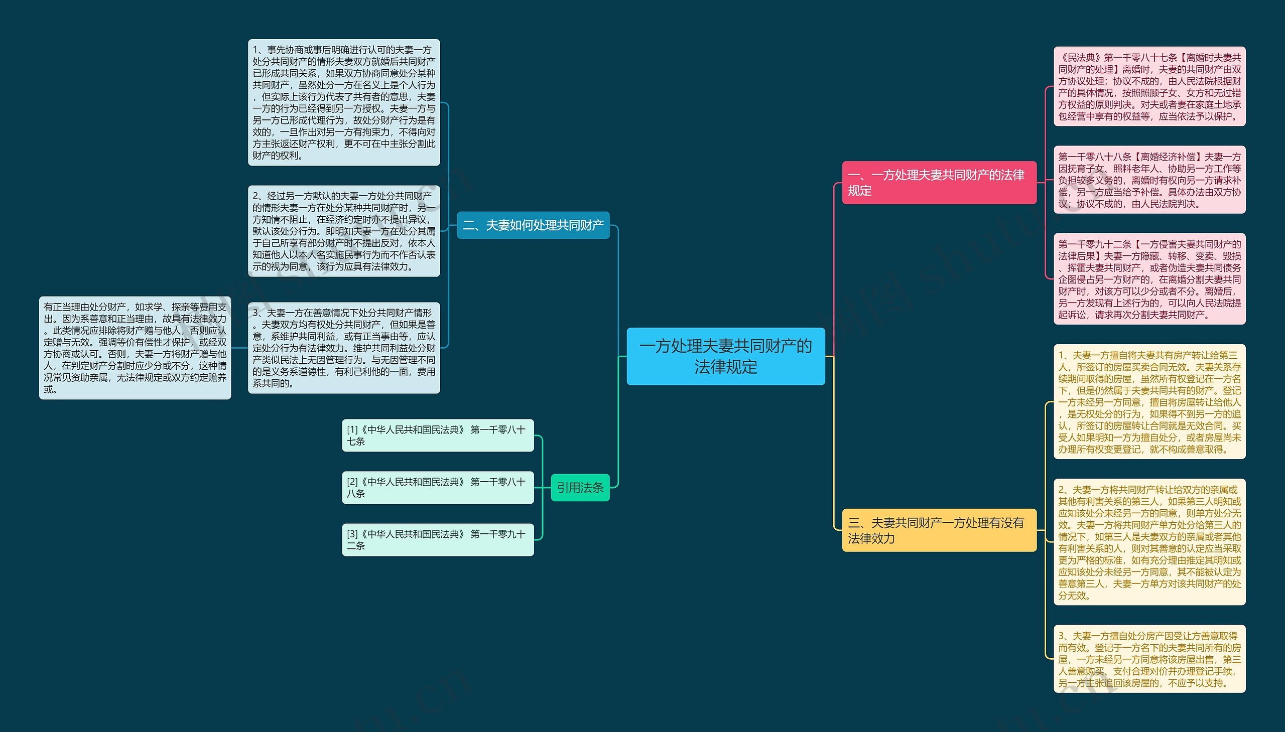 树图思维导图提供《一方处理夫妻共同财产的法律规定》在线思维导图免费制作,点击“编辑”按钮,可对《一方处理夫妻共同财产的法律规定》进行在线思维导图编辑,本思维导图属于思维导图模板主题,文件编号是:952c7f88358a0b830767e4bf297216b2