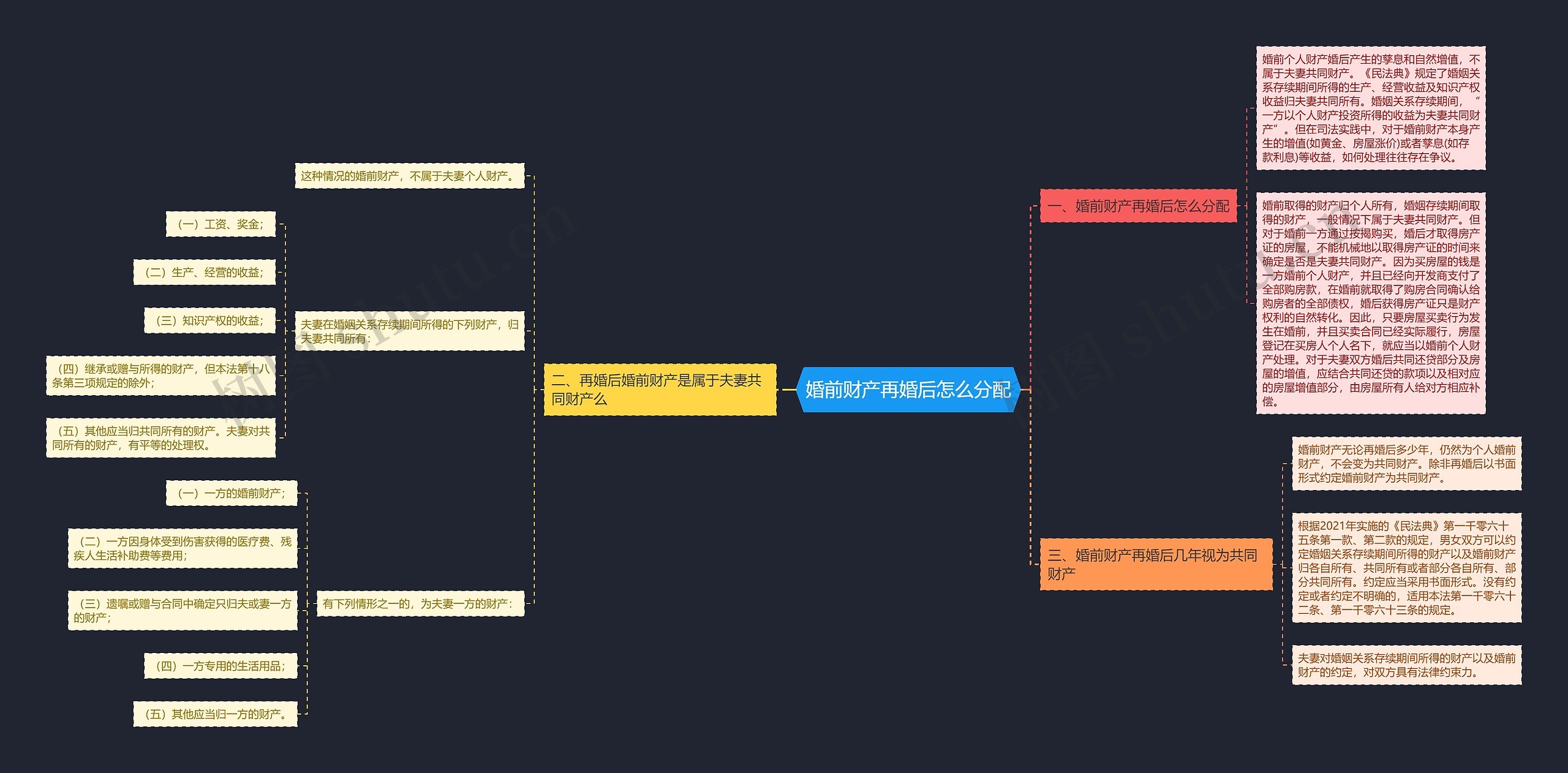 树图思维导图提供《婚前财产再婚后怎么分配》在线思维导图免费制作,点击“编辑”按钮,可对《婚前财产再婚后怎么分配》进行在线思维导图编辑,本思维导图属于思维导图模板主题,文件编号是:163a9668527eccfa0775433382173fc0
