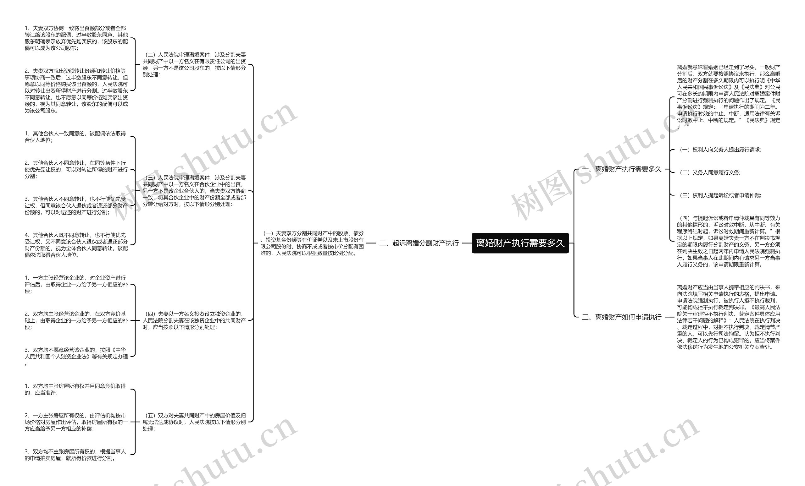 树图思维导图提供《离婚财产执行需要多久》在线思维导图免费制作,点击“编辑”按钮,可对《离婚财产执行需要多久》进行在线思维导图编辑,本思维导图属于思维导图模板主题,文件编号是:bed3c2a9a94da9eba6754bee8cd1fa8d