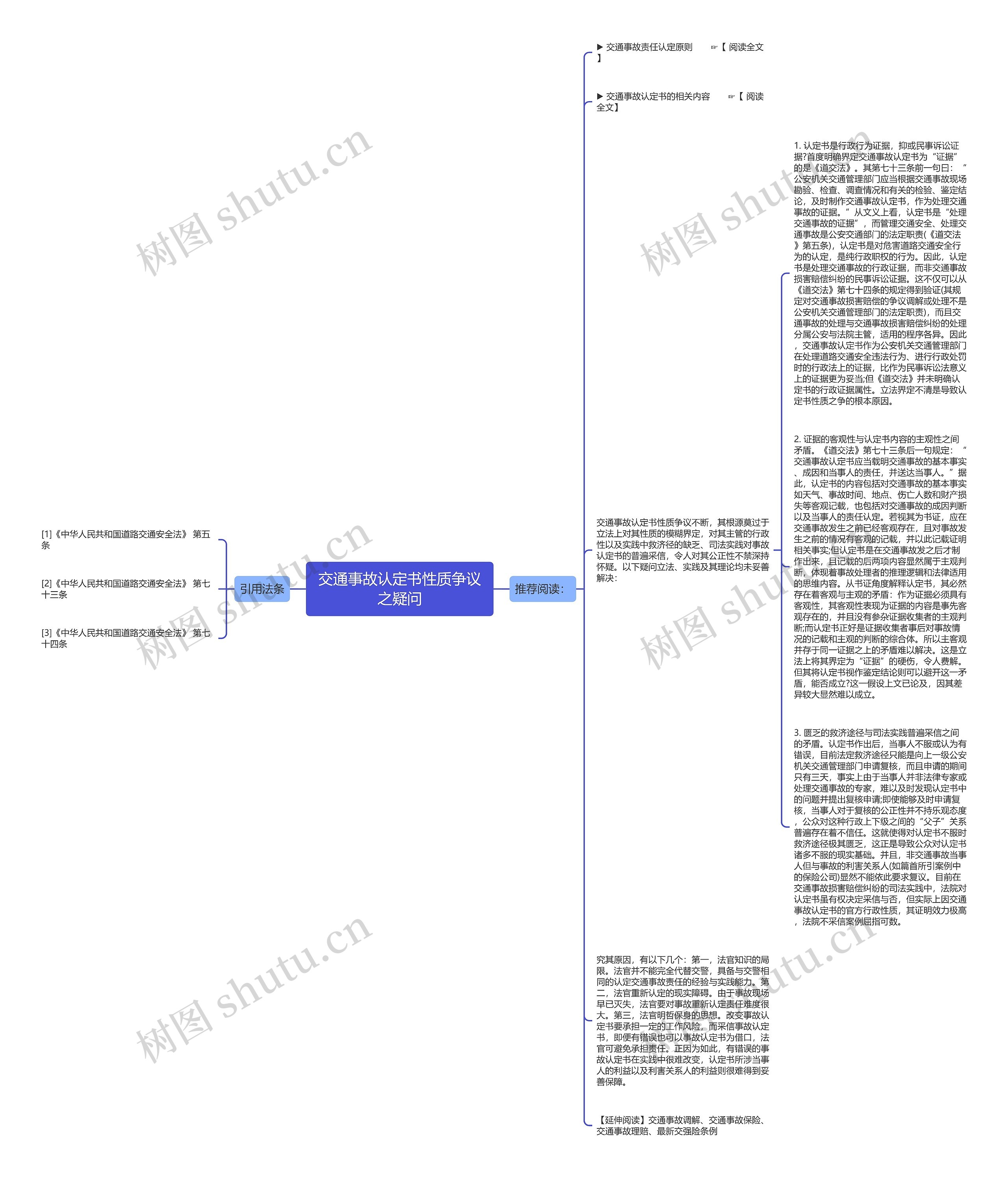 2. 证据的客观性与认定书内容的主观性之间矛盾。《道交法》第七十三条后一句规定:“交通事故认定书应当载明交通事故的基本事实、成因和当事人的责任,并送达当事人。”据此,认定书的内容包括对交通事故的基本事实如天气、事故时间、地点、伤亡人数和财产损失等客观记载,也包括对交通事故的成因判断以及当事人的责任认定。若视其为书证,应在交通事故发生之前已经客观存在,且对事故发生之前的情况有客观的记载,并以此记载证明相关事实;但认定书是在交通事故发之后才制作出来,且记载的后两项内容显然属于主观判断,体现着事故处理者的推理逻辑和法律适用的思维内容。从书证角度解释认定书,其必然存在着客观与主观的矛盾:作为证据必须具有客观性,其客观性表现为证据的内容是事先客观存在的,并且没有参杂证据收集者的主观判断;而认定书正好是证据收集者事后对事故情况的记载和主观的判断的综合体。所以主客观并存于同一证据之上的矛盾难以解决。这是立法上将其界定为“证据”的硬伤,令人费解。但其将认定书视作鉴定结论则可以避开这一矛盾,能否成立?这一假设上文已论及,因其差异较大显然难以成立。
