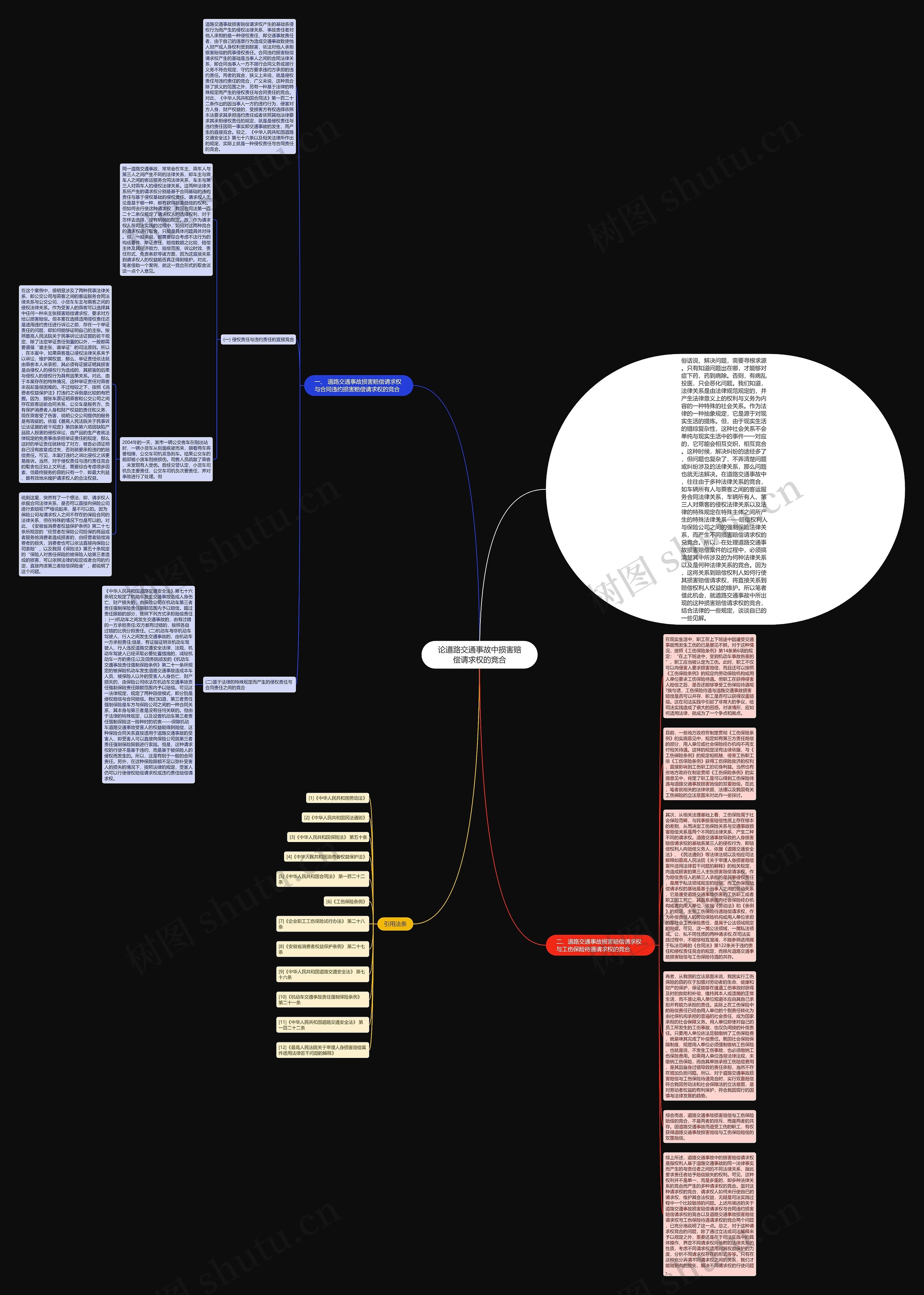综上所述,道路交通事故中的损害赔偿请求权是指权利人基于道路交通事故的同一法律事实而产生的与责任者之间的不同法律关系,据此要求责任者给予赔偿损失的权利。可见,这种权利并不是单一,而是多重的,即多种法律关系的竞合而产生的多种请求权的竞合。面对这种请求权的竞合,请求权人如何来行使自已的请求权,维护其合法权益,无疑是司法实践过程中一个比较敏感的问题。上述所阐述的关于道路交通事故损害赔偿请求权与合同违约损害赔偿请求权的竞合以及道路交通事故损害赔偿请求权与工伤保险待遇请求权的竞合两个问题,已充分地说明了这一点。总之,对于这种请求权竞合的问题,除了通过立法或司法解释来予以规定之外,重要还是在于司法实践中的具体操作,界定不同请求权所依附的法律关系的性质,考虑不同请求权适用对其权益保护的力度,分析不同请求权存在的形式等等。只有在这种充分弄清不同请求权之间的关系,我们才能做到有的放矢,解决不同请求权的行使问题。
