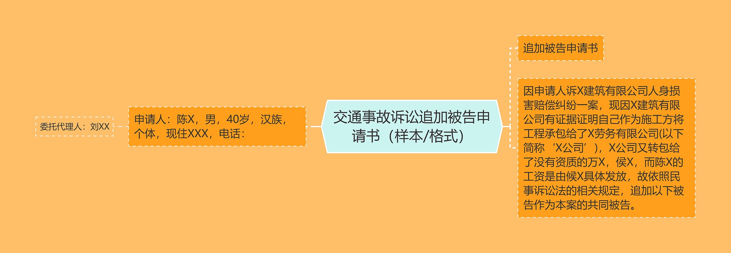 树图思维导图提供《交通事故诉讼追加被告申请书(样本/格式)》在线思维导图免费制作,点击“编辑”按钮,可对《交通事故诉讼追加被告申请书(样本/格式)》进行在线思维导图编辑,本思维导图属于思维导图模板主题,文件编号是:459cc05c11b018d72afe3cbfdd833ea7