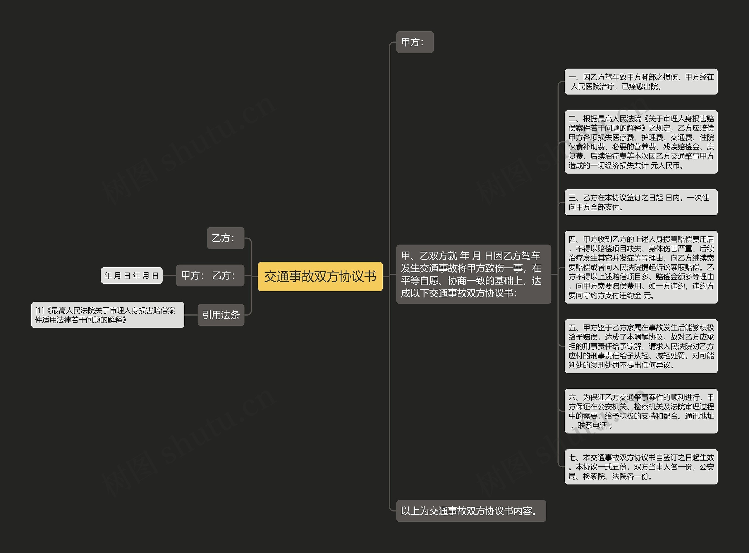 二、根据最高人民法院《关于审理人身损害赔偿案件若干问题的解释》之规定,乙方应赔偿甲方各项损失医疗费、护理费、交通费、住院伙食补助费、必要的营养费、残疾赔偿金、康复费、后续治疗费等本次因乙方交通肇事甲方造成的一切经济损失共计 元人民币。