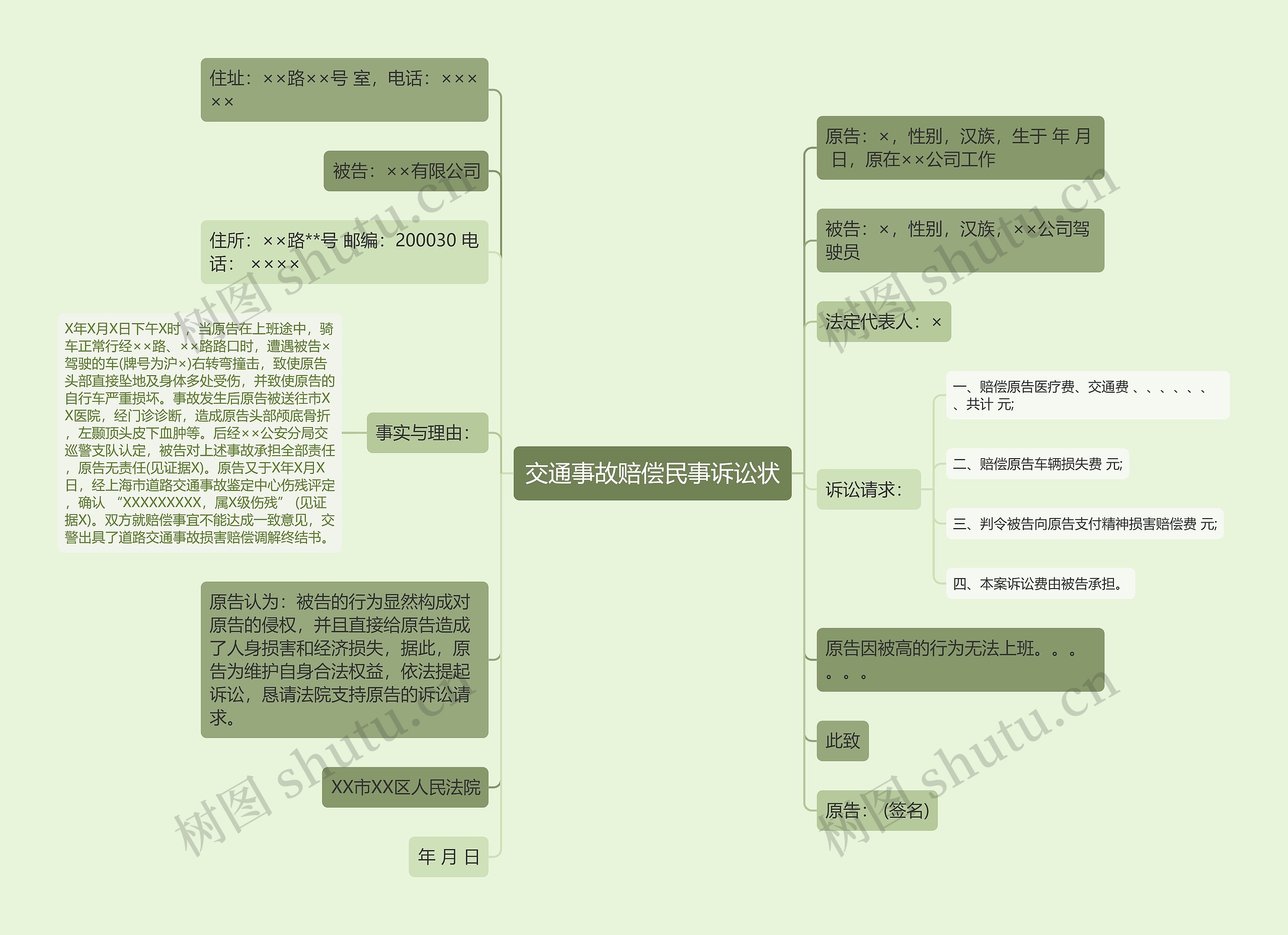 X年X月X日下午X时 ,当原告在上班途中,骑车正常行经××路、××路路口时,遭遇被告×驾驶的车(牌号为沪×)右转弯撞击,致使原告头部直接坠地及身体多处受伤,并致使原告的自行车严重损坏。事故发生后原告被送往市XX医院,经门诊诊断,造成原告头部颅底骨折,左颞顶头皮下血肿等。后经××公安分局交巡警支队认定,被告对上述事故承担全部责任,原告无责任(见证据X)。原告又于X年X月X日,经上海市道路交通事故鉴定中心伤残评定,确认 “XXXXXXXXX,属X级伤残” (见证据X)。双方就赔偿事宜不能达成一致意见,交警出具了道路交通事故损害赔偿调解终结书。