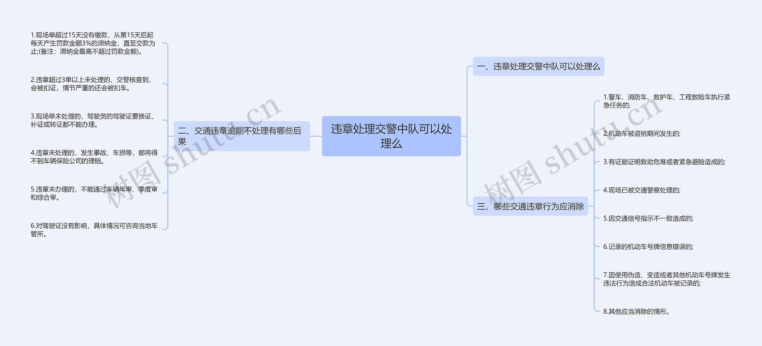 树图思维导图提供《违章处理交警中队可以处理么》在线思维导图免费制作,点击“编辑”按钮,可对《违章处理交警中队可以处理么》进行在线思维导图编辑,本思维导图属于思维导图模板主题,文件编号是:d719fda5ef2218c1b08af90ded3d8900