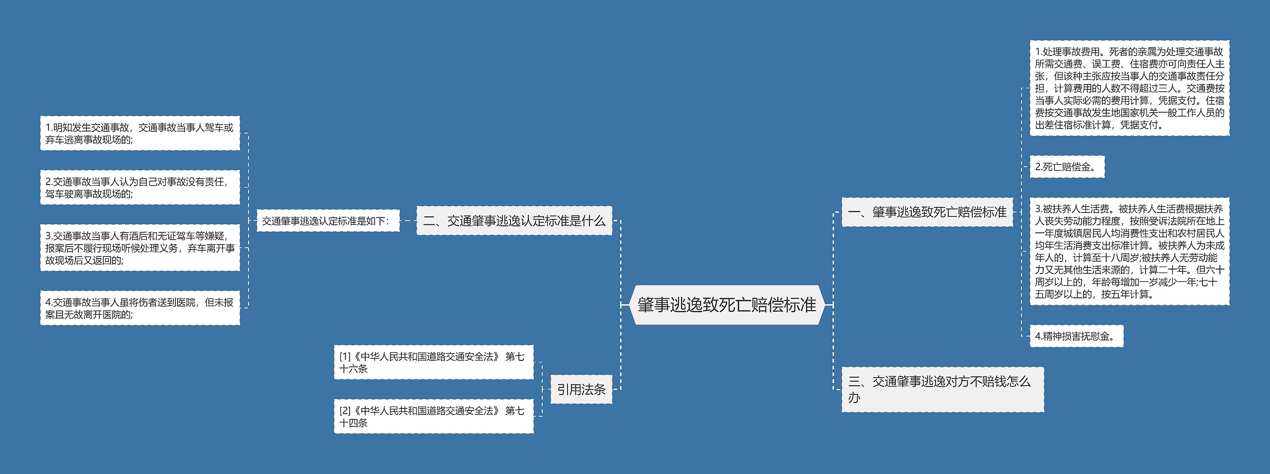 树图思维导图提供《肇事逃逸致死亡赔偿标准》在线思维导图免费制作,点击“编辑”按钮,可对《肇事逃逸致死亡赔偿标准》进行在线思维导图编辑,本思维导图属于思维导图模板主题,文件编号是:c45edd25d2b08278bb411964fa868318