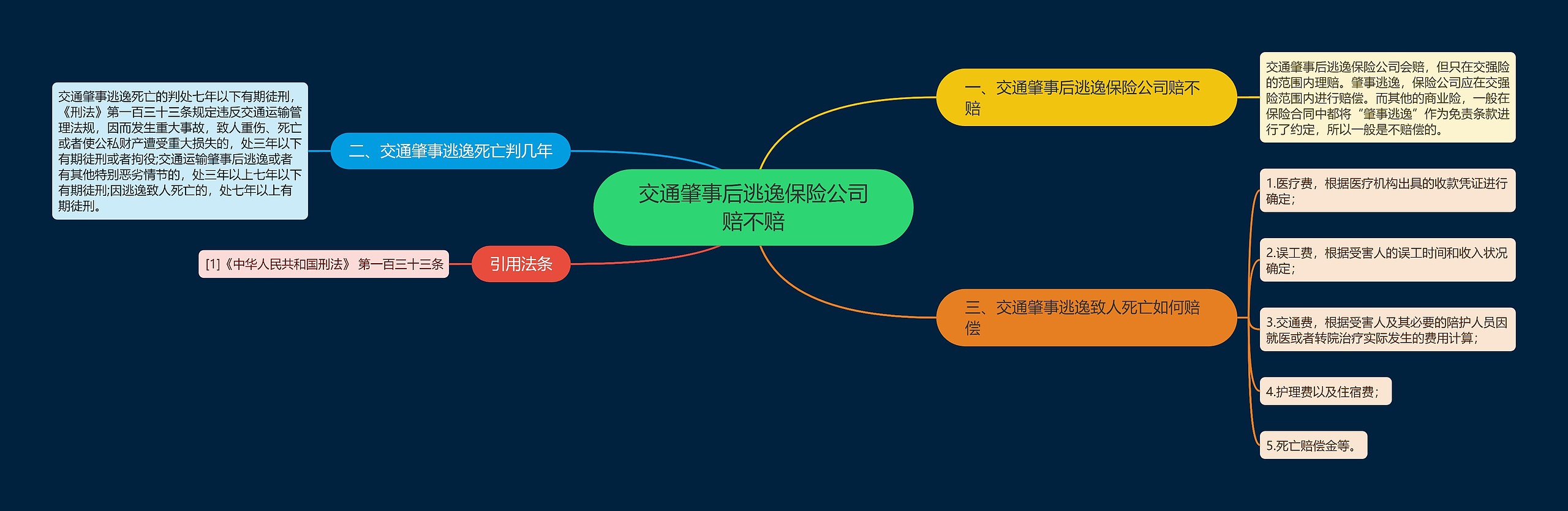 树图思维导图提供《交通肇事后逃逸保险公司赔不赔》在线思维导图免费制作,点击“编辑”按钮,可对《交通肇事后逃逸保险公司赔不赔》进行在线思维导图编辑,本思维导图属于思维导图模板主题,文件编号是:c8190fc494443b1984f777b649aa4478
