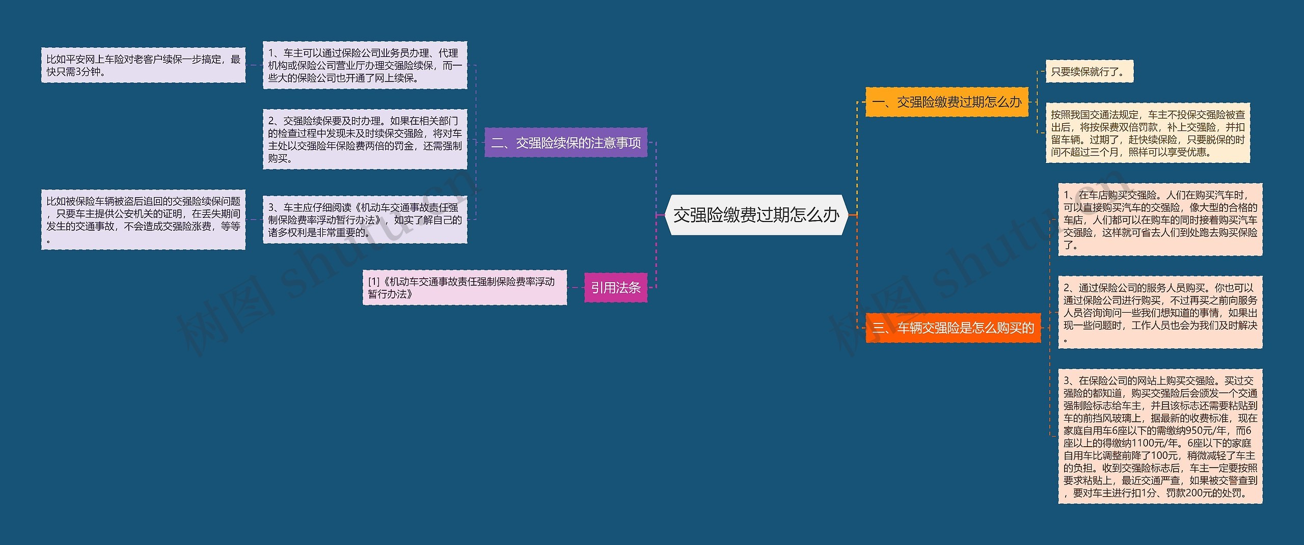 树图思维导图提供《交强险缴费过期怎么办》在线思维导图免费制作,点击“编辑”按钮,可对《交强险缴费过期怎么办》进行在线思维导图编辑,本思维导图属于思维导图模板主题,文件编号是:63ad7d19c1e36c8a97304cc5496e5422
