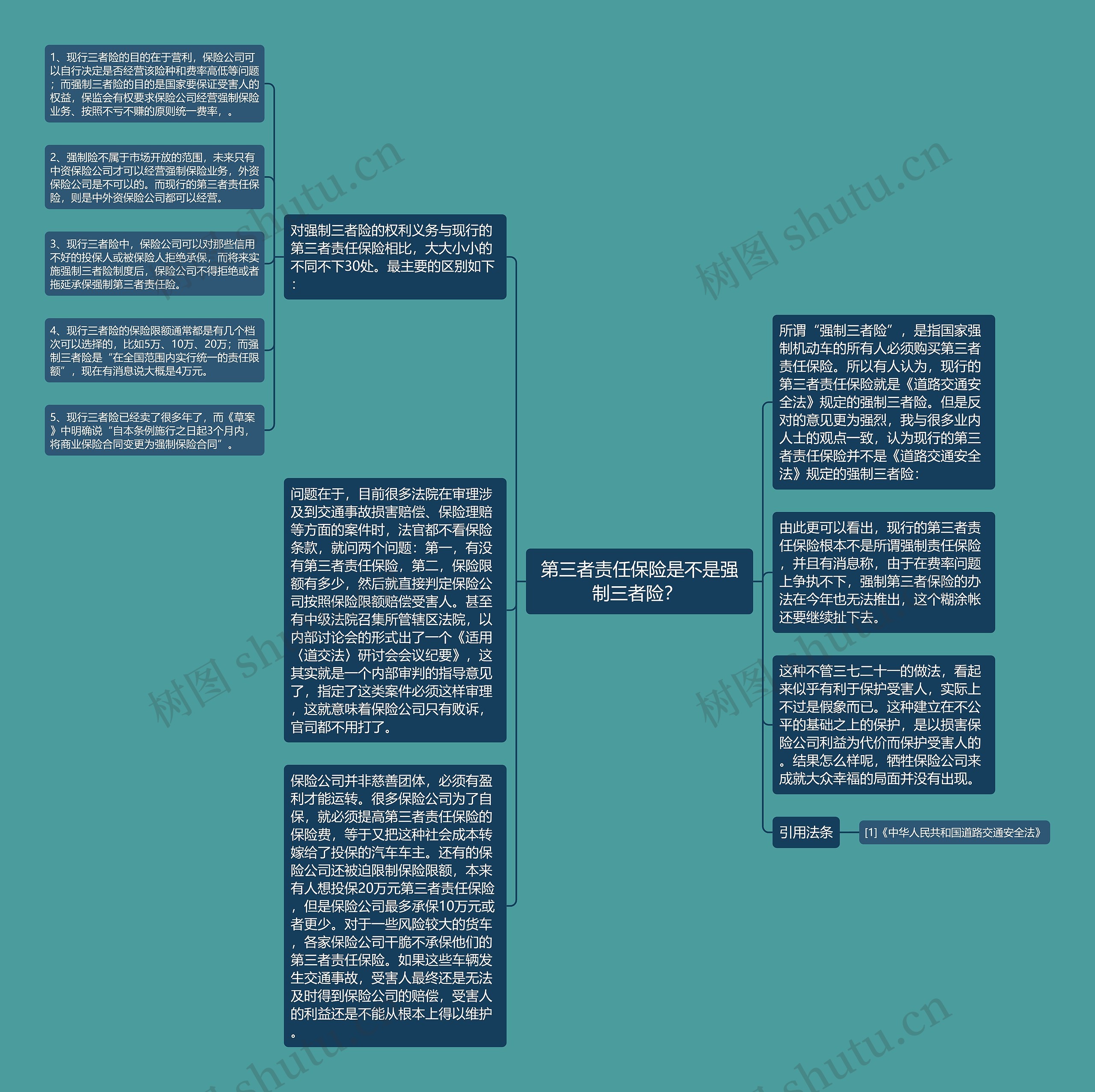 所谓“强制三者险”,是指国家强制机动车的所有人必须购买第三者责任保险。所以有人认为,现行的第三者责任保险就是《道路交通安全法》规定的强制三者险。但是反对的意见更为强烈,我与很多业内人士的观点一致,认为现行的第三者责任保险并不是《道路交通安全法》规定的强制三者险: