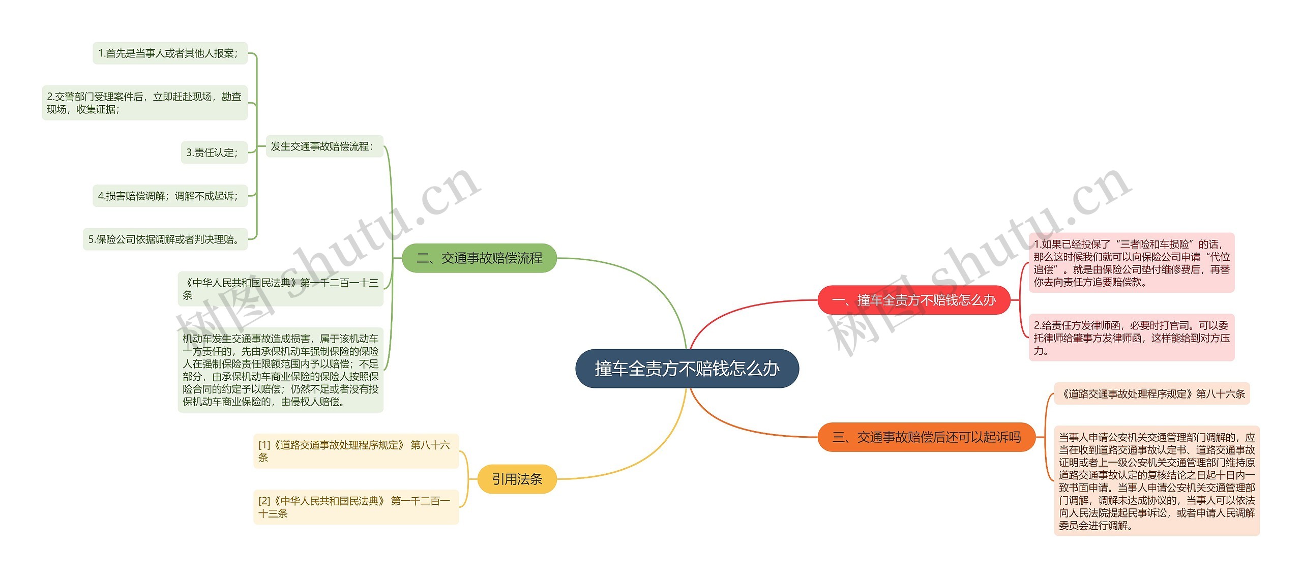 树图思维导图提供《撞车全责方不赔钱怎么办》在线思维导图免费制作,点击“编辑”按钮,可对《撞车全责方不赔钱怎么办》进行在线思维导图编辑,本思维导图属于思维导图模板主题,文件编号是:82af57398469f775abb2da8253f72133