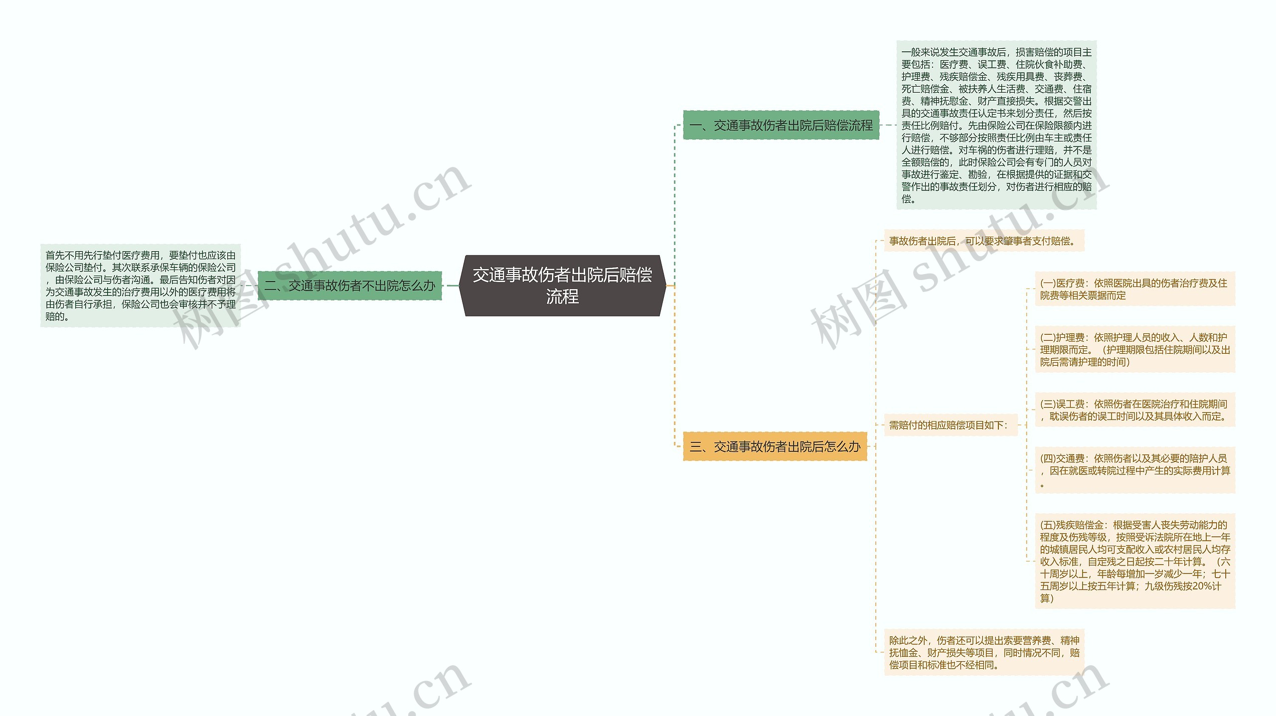 树图思维导图提供《交通事故伤者出院后赔偿流程》在线思维导图免费制作,点击“编辑”按钮,可对《交通事故伤者出院后赔偿流程》进行在线思维导图编辑,本思维导图属于思维导图模板主题,文件编号是:bdc2d0b829ef632688d53ff47c1d4618
