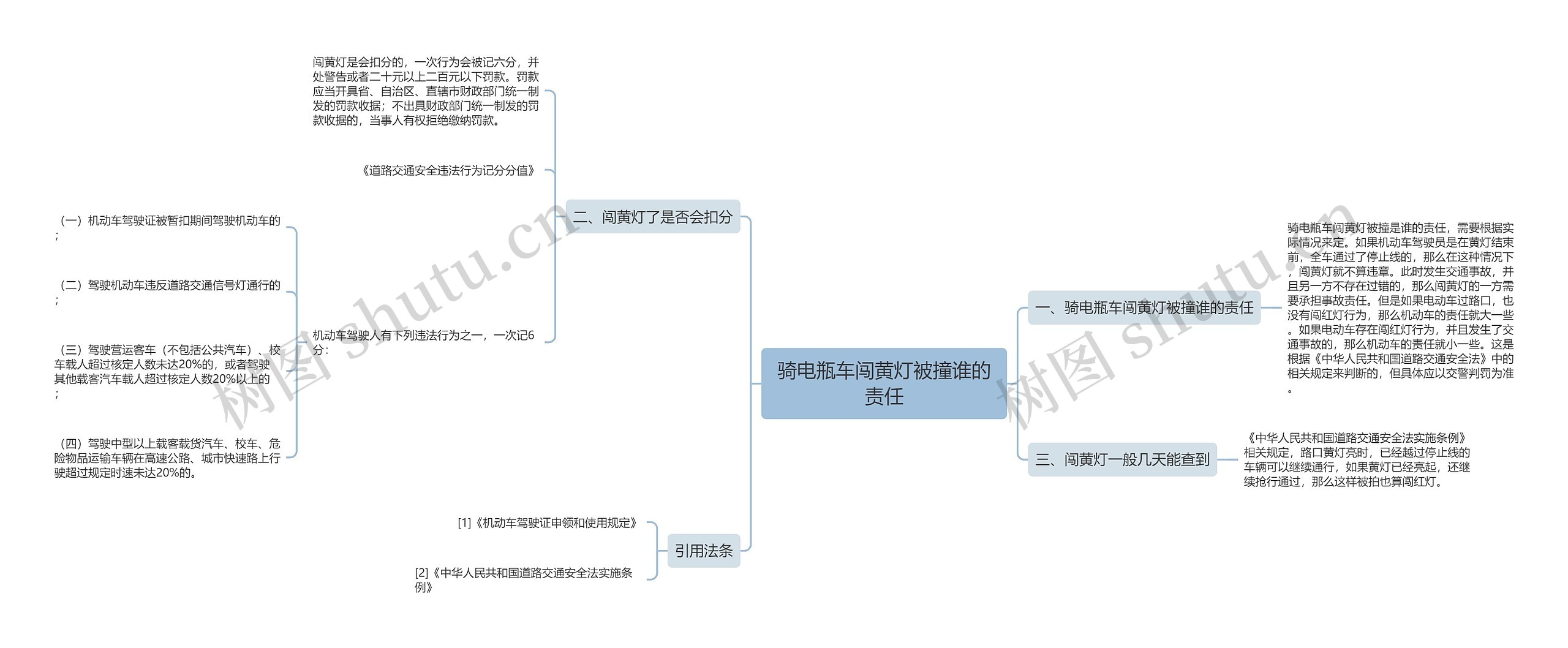 树图思维导图提供《骑电瓶车闯黄灯被撞谁的责任》在线思维导图免费制作,点击“编辑”按钮,可对《骑电瓶车闯黄灯被撞谁的责任》进行在线思维导图编辑,本思维导图属于思维导图模板主题,文件编号是:b5c76a3c19b76681fdb53d267de85e75