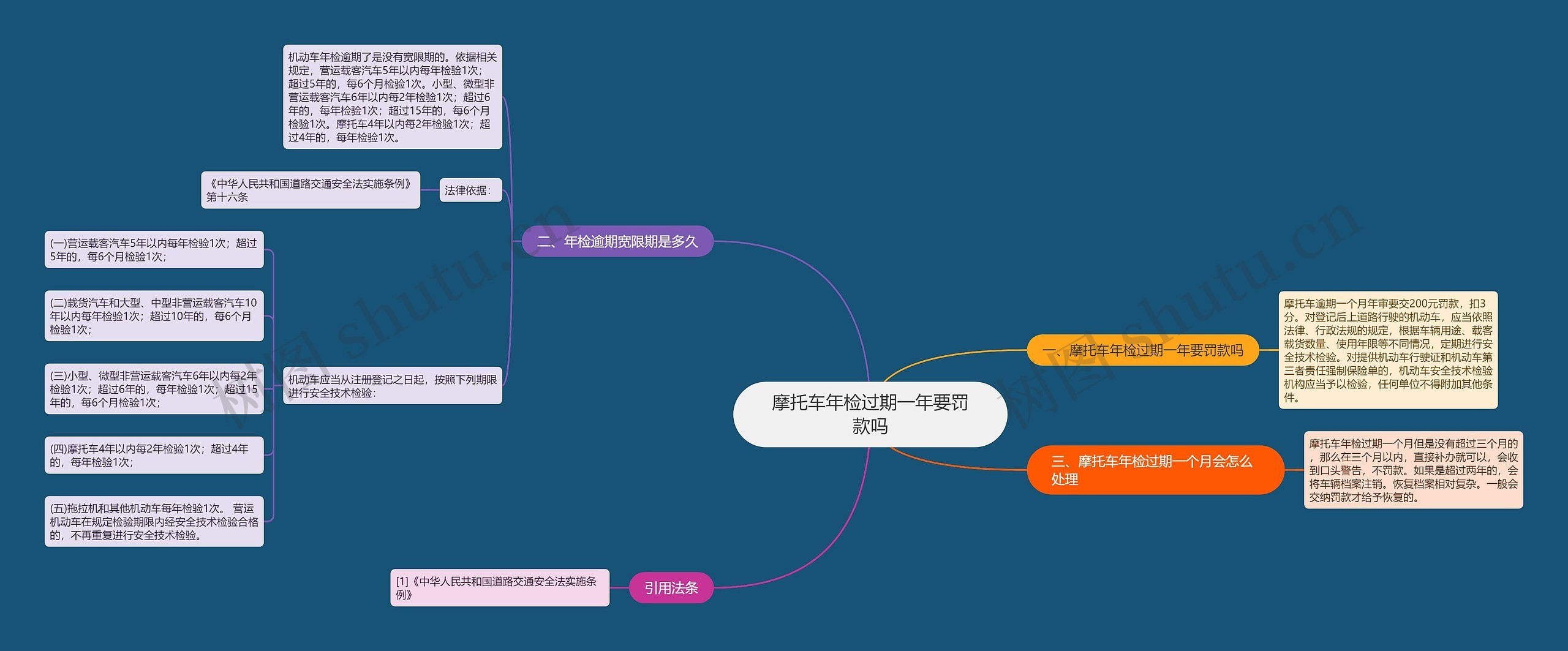 树图思维导图提供《摩托车年检过期一年要罚款吗》在线思维导图免费制作,点击“编辑”按钮,可对《摩托车年检过期一年要罚款吗》进行在线思维导图编辑,本思维导图属于思维导图模板主题,文件编号是:a626e79e8871051971a347bd651c0682
