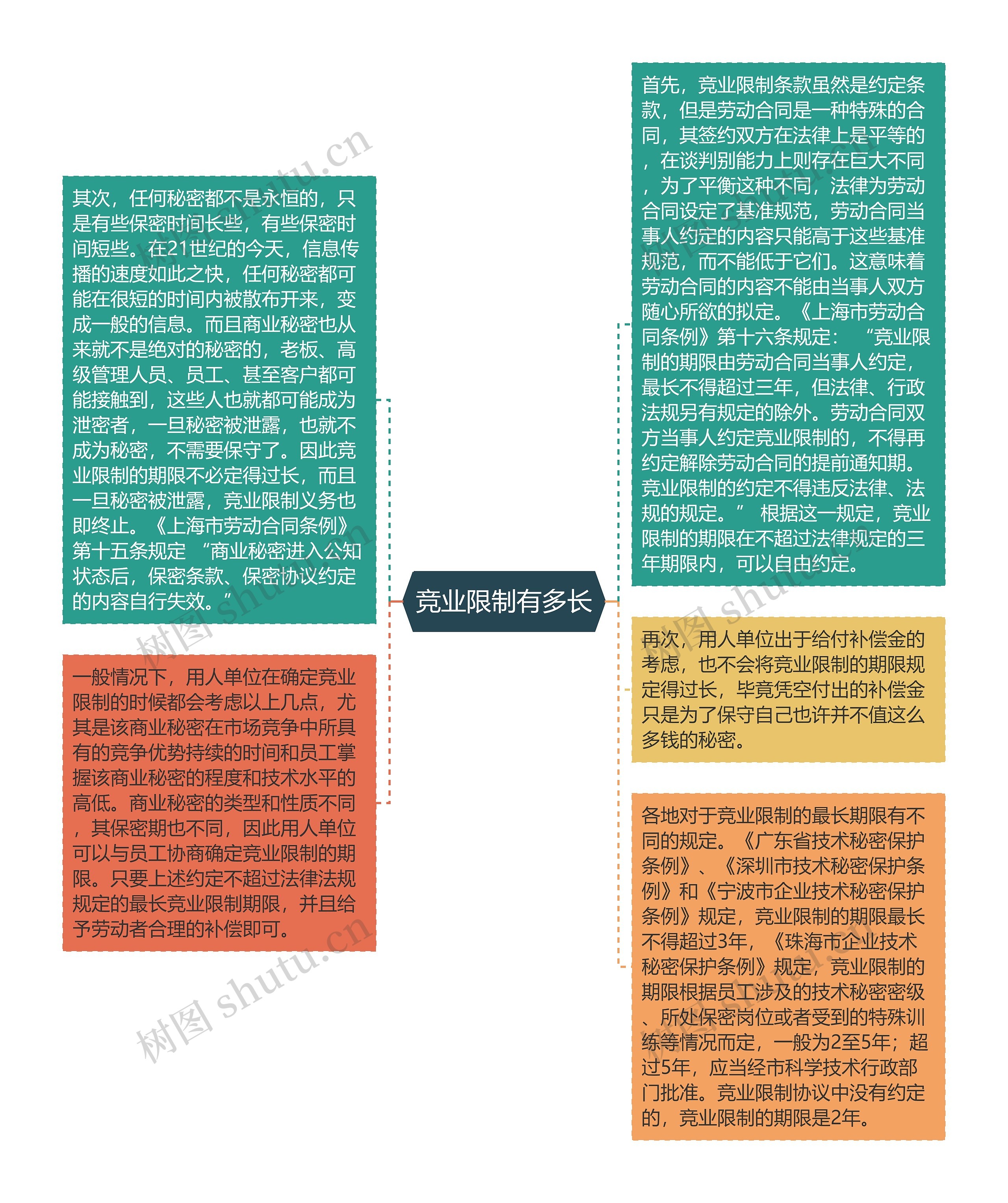 各地对于竞业限制的最长期限有不同的规定。《广东省技术秘密保护条例》、《深圳市技术秘密保护条例》和《宁波市企业技术秘密保护条例》规定,竞业限制的期限最长不得超过3年,《珠海市企业技术秘密保护条例》规定,竞业限制的期限根据员工涉及的技术秘密密级、所处保密岗位或者受到的特殊训练等情况而定,一般为2至5年;超过5年,应当经市科学技术行政部门批准。竞业限制协议中没有约定的,竞业限制的期限是2年。