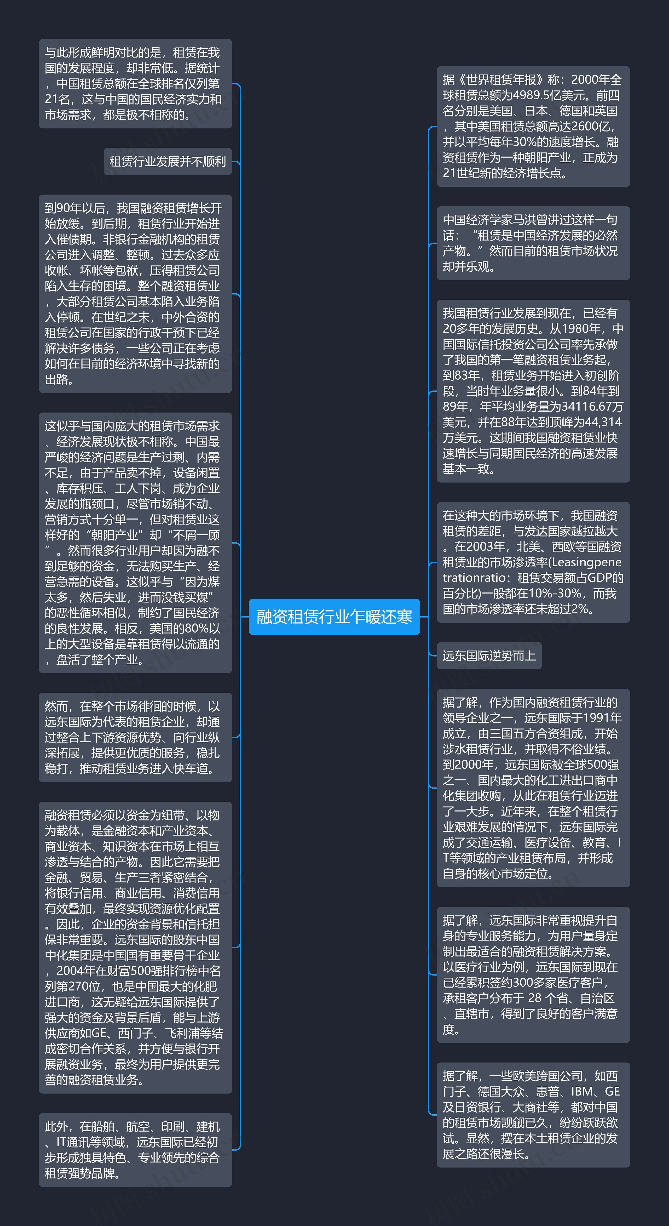 这似乎与国内庞大的租赁市场需求、经济发展现状极不相称。中国最严峻的经济问题是生产过剩、内需不足,由于产品卖不掉,设备闲置、库存积压、工人下岗、成为企业发展的瓶颈口,尽管市场销不动、营销方式十分单一,但对租赁业这样好的“朝阳产业”却“不屑一顾”。然而很多行业用户却因为融不到足够的资金,无法购买生产、经营急需的设备。这似乎与“因为煤太多,然后失业,进而没钱买煤”的恶性循环相似,制约了国民经济的良性发展。相反,美国的80%以上的大型设备是靠租赁得以流通的,盘活了整个产业。