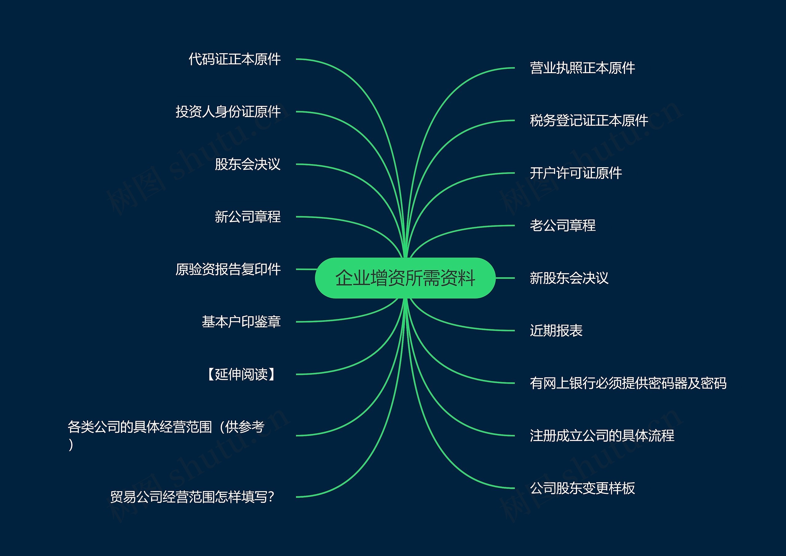 树图思维导图提供《企业增资所需资料》在线思维导图免费制作,点击“编辑”按钮,可对《企业增资所需资料》进行在线思维导图编辑,本思维导图属于思维导图模板主题,文件编号是:9fbb10f1c89e0ae816034b7737ed025d