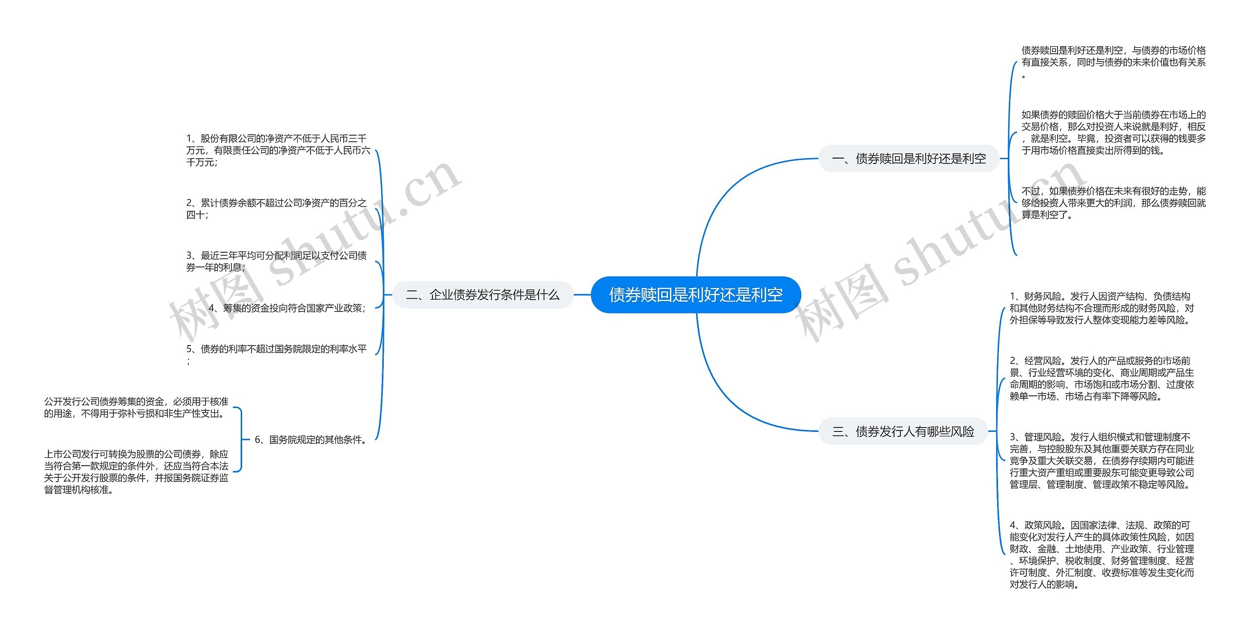 树图思维导图提供《债券赎回是利好还是利空》在线思维导图免费制作,点击“编辑”按钮,可对《债券赎回是利好还是利空》进行在线思维导图编辑,本思维导图属于思维导图模板主题,文件编号是:5de1786206107b0b76a292cc4769506d