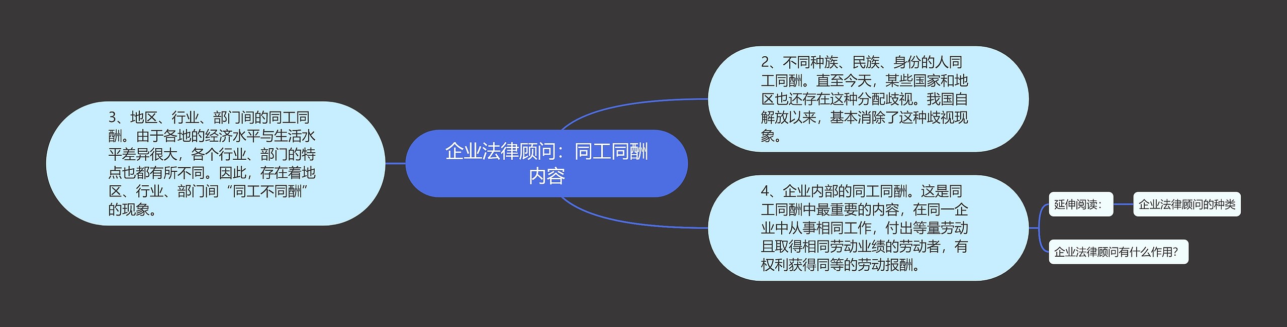 树图思维导图提供《企业法律顾问:同工同酬内容》在线思维导图免费制作,点击“编辑”按钮,可对《企业法律顾问:同工同酬内容》进行在线思维导图编辑,本思维导图属于思维导图模板主题,文件编号是:ec29139556879132a0d02bef2c817880