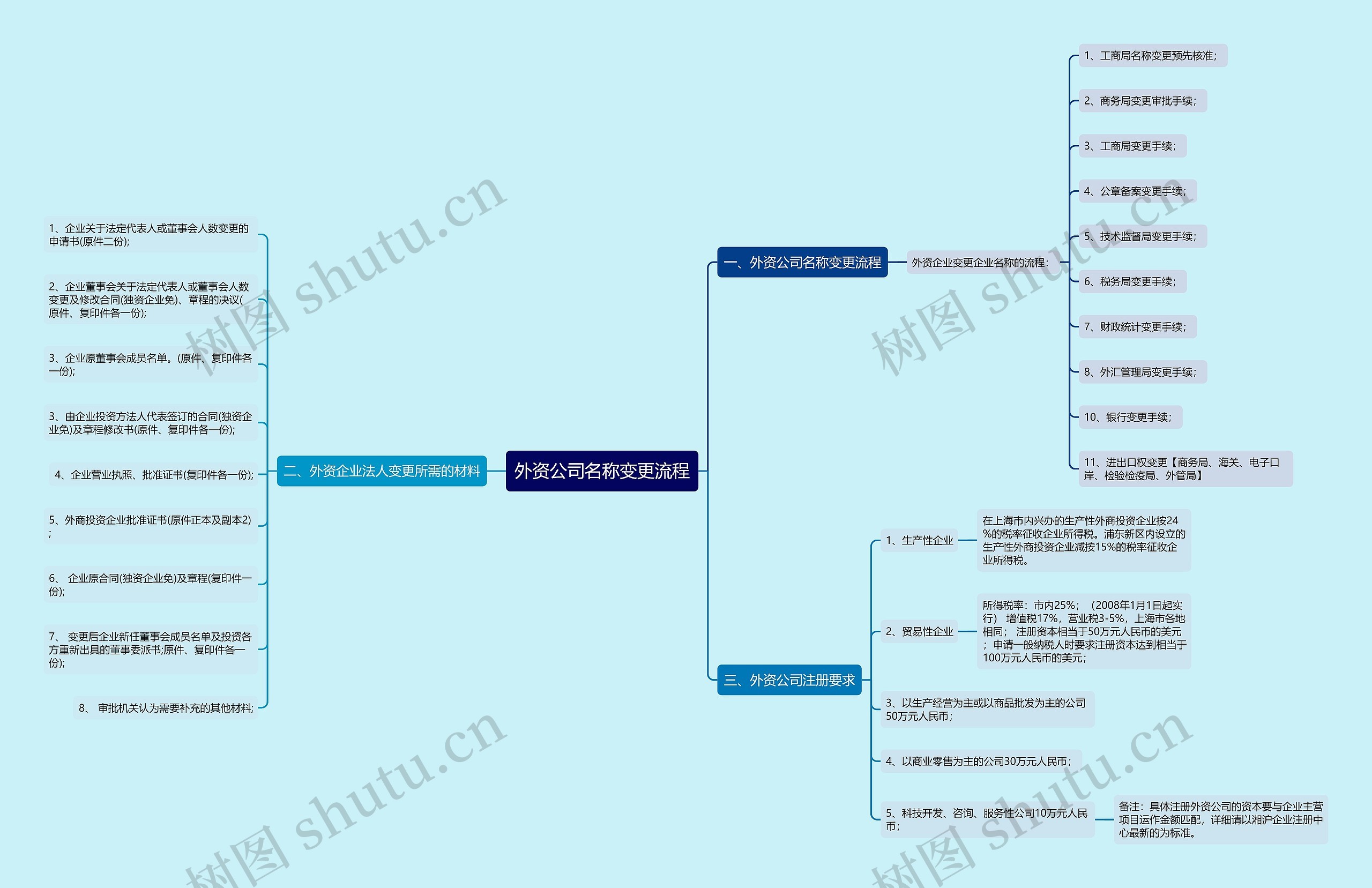 树图思维导图提供《外资公司名称变更流程》在线思维导图免费制作,点击“编辑”按钮,可对《外资公司名称变更流程》进行在线思维导图编辑,本思维导图属于思维导图模板主题,文件编号是:804d7b377456e2062b2be546780697a2