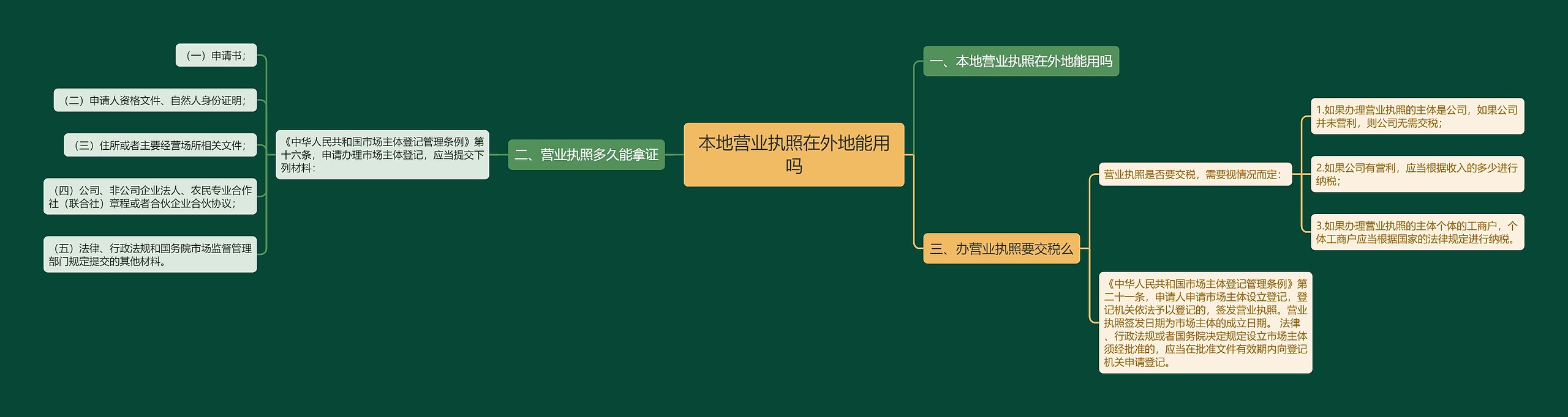 树图思维导图提供《本地营业执照在外地能用吗》在线思维导图免费制作,点击“编辑”按钮,可对《本地营业执照在外地能用吗》进行在线思维导图编辑,本思维导图属于思维导图模板主题,文件编号是:1aa66d9a14c510d51f8807a5d433b86f