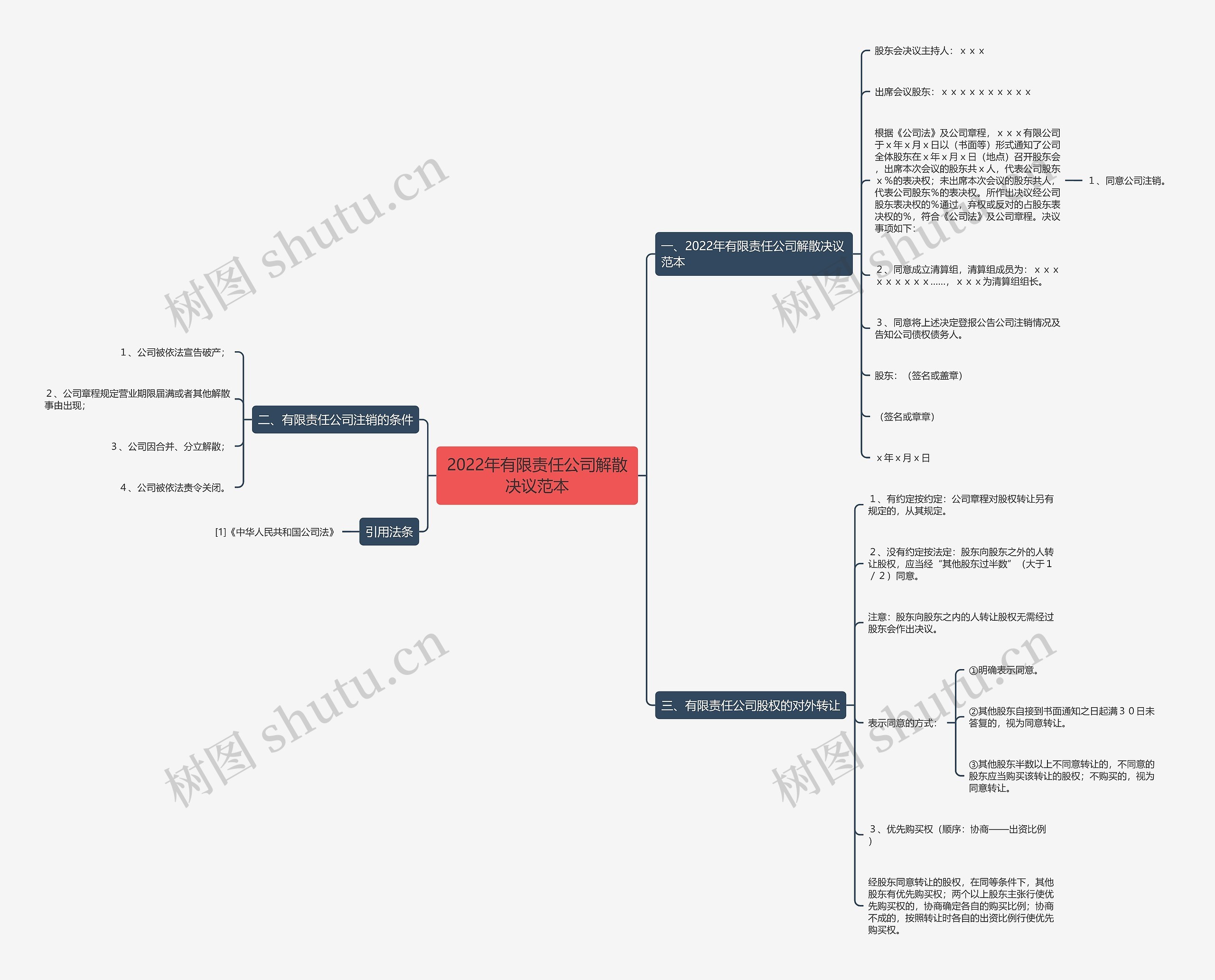 树图思维导图提供《2022年有限责任公司解散决议范本》在线思维导图免费制作,点击“编辑”按钮,可对《2022年有限责任公司解散决议范本》进行在线思维导图编辑,本思维导图属于思维导图模板主题,文件编号是:d46120888fe9b7a1f0d50124b7cbaf42