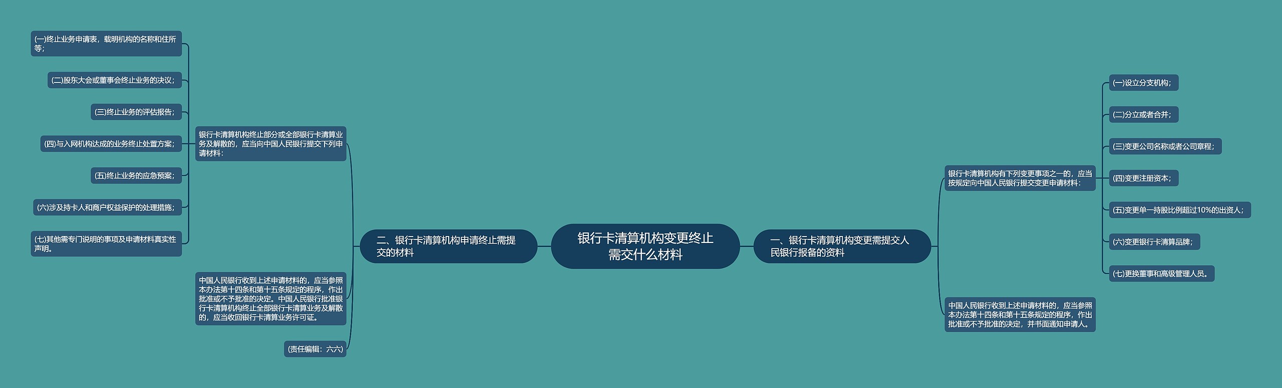 树图思维导图提供《银行卡清算机构变更终止需交什么材料》在线思维导图免费制作,点击“编辑”按钮,可对《银行卡清算机构变更终止需交什么材料》进行在线思维导图编辑,本思维导图属于思维导图模板主题,文件编号是:b89d1e8950db1c7068c11420e68aff02