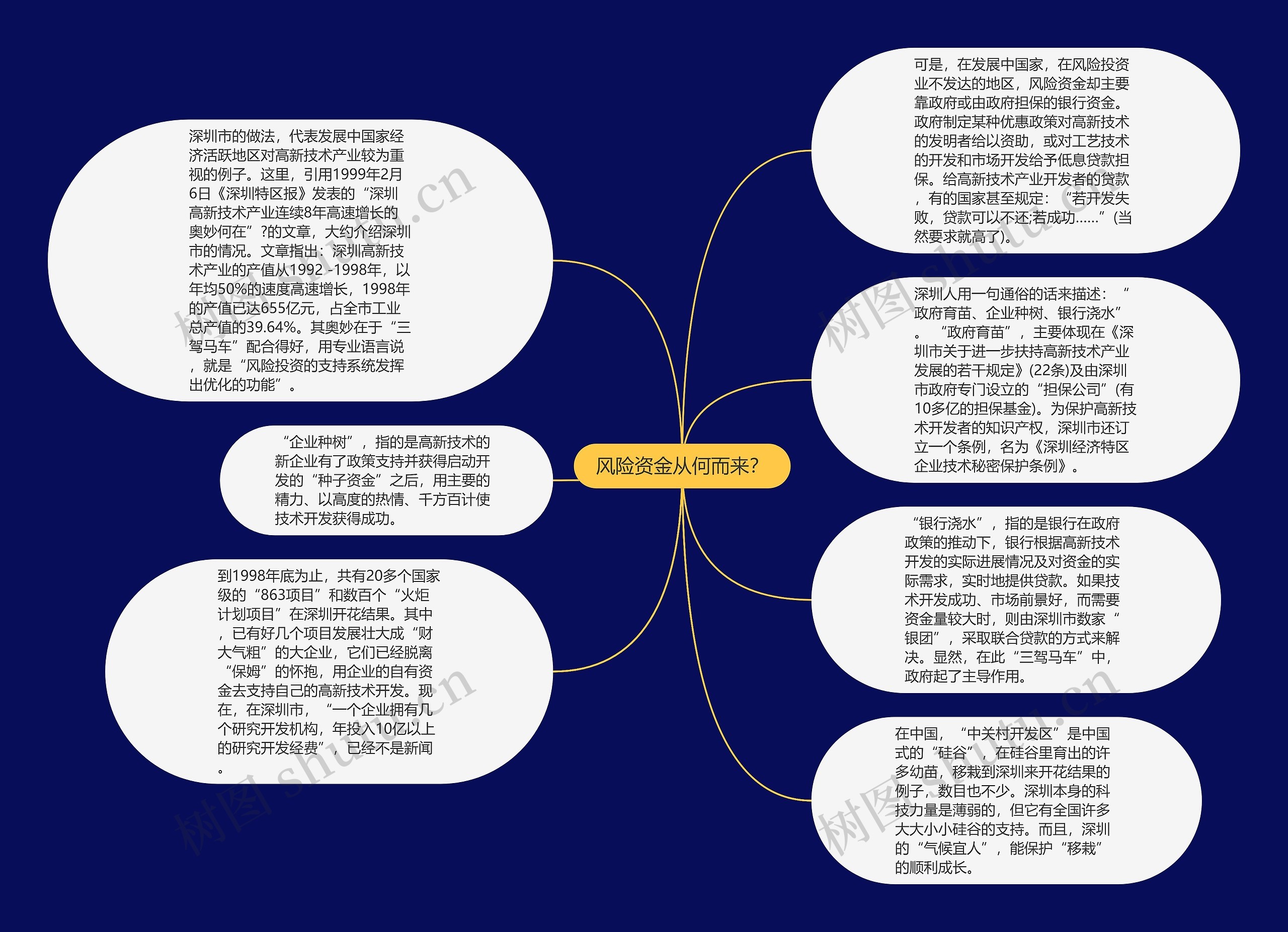深圳人用一句通俗的话来描述:“政府育苗、企业种树、银行浇水”。 “政府育苗”,主要体现在《深圳市关于进一步扶持高新技术产业发展的若干规定》(22条)及由深圳市政府专门设立的“担保公司”(有10多亿的担保基金)。为保护高新技术开发者的知识产权,深圳市还订立一个条例,名为《深圳经济特区企业技术秘密保护条例》。