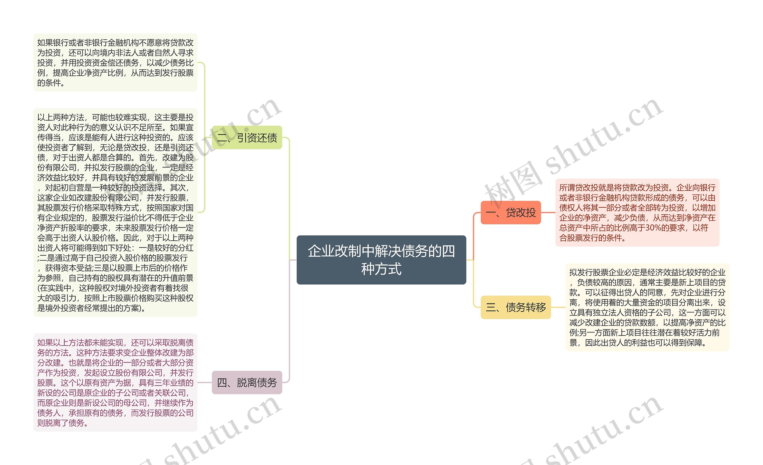 树图思维导图提供《企业改制中解决债务的四种方式》在线思维导图免费制作,点击“编辑”按钮,可对《企业改制中解决债务的四种方式》进行在线思维导图编辑,本思维导图属于思维导图模板主题,文件编号是:5950b6d3351f6c73a16261226ad2a277