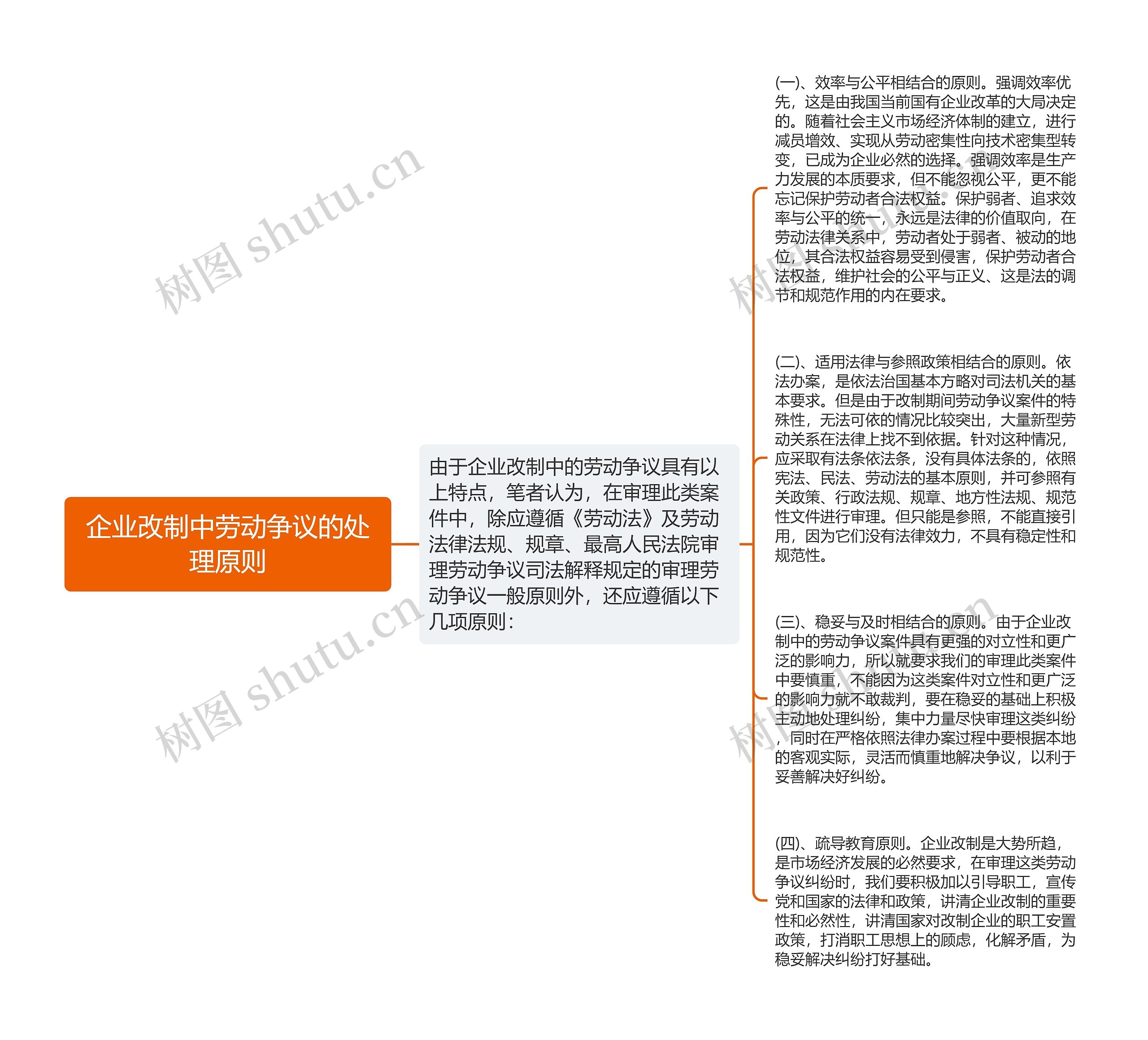 (四)、疏导教育原则。企业改制是大势所趋,是市场经济发展的必然要求,在审理这类劳动争议纠纷时,我们要积极加以引导职工,宣传党和国家的法律和政策,讲清企业改制的重要性和必然性,讲清国家对改制企业的职工安置政策,打消职工思想上的顾虑,化解矛盾,为稳妥解决纠纷打好基础。