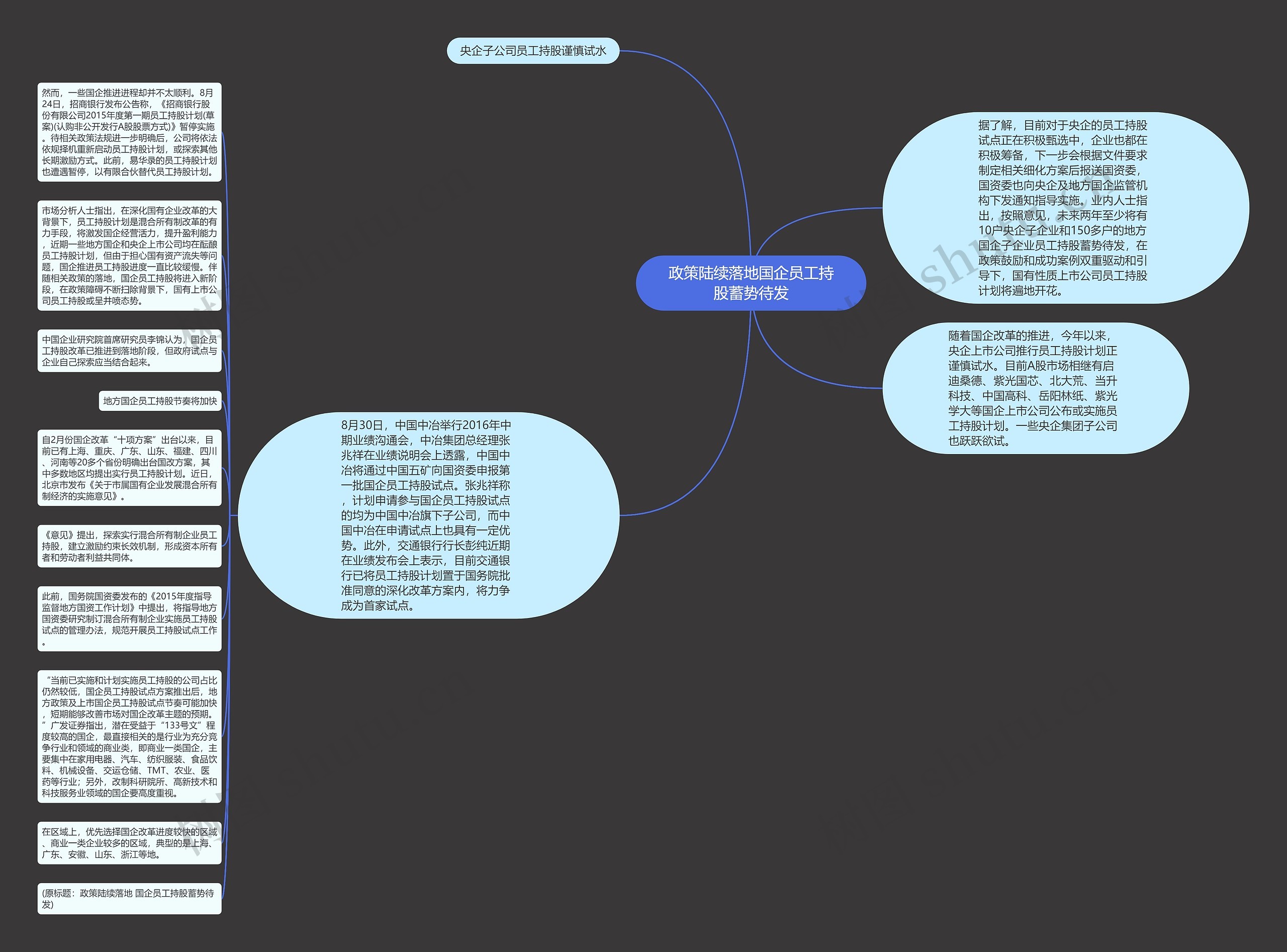 此前,国务院国资委发布的《2015年度指导监督地方国资工作计划》中提出,将指导地方国资委研究制订混合所有制企业实施员工持股试点的管理办法,规范开展员工持股试点工作。
