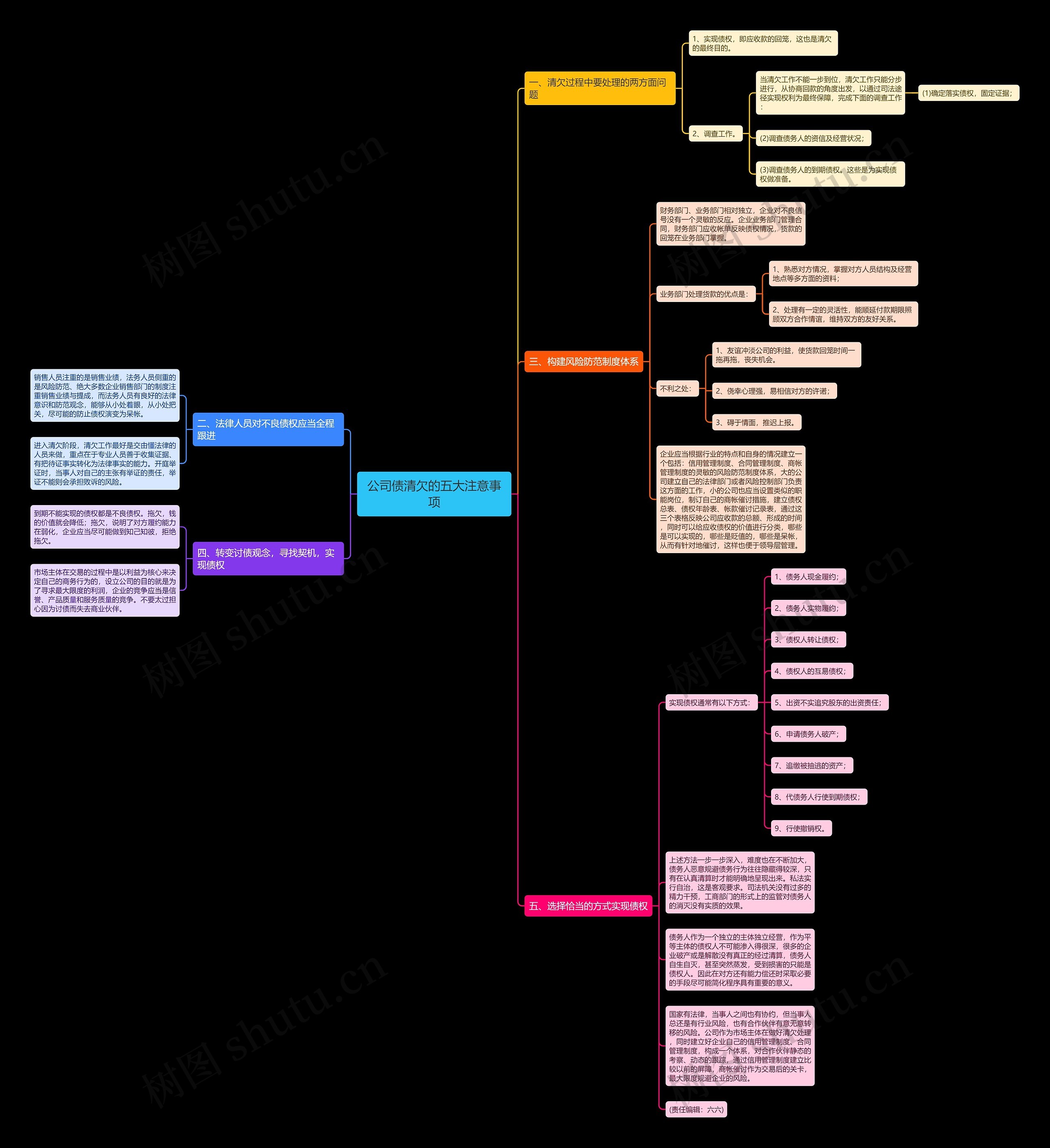 树图思维导图提供《公司债清欠的五大注意事项》在线思维导图免费制作,点击“编辑”按钮,可对《公司债清欠的五大注意事项》进行在线思维导图编辑,本思维导图属于思维导图模板主题,文件编号是:0eb64b4228bcbe8463e7a6e7905c506e