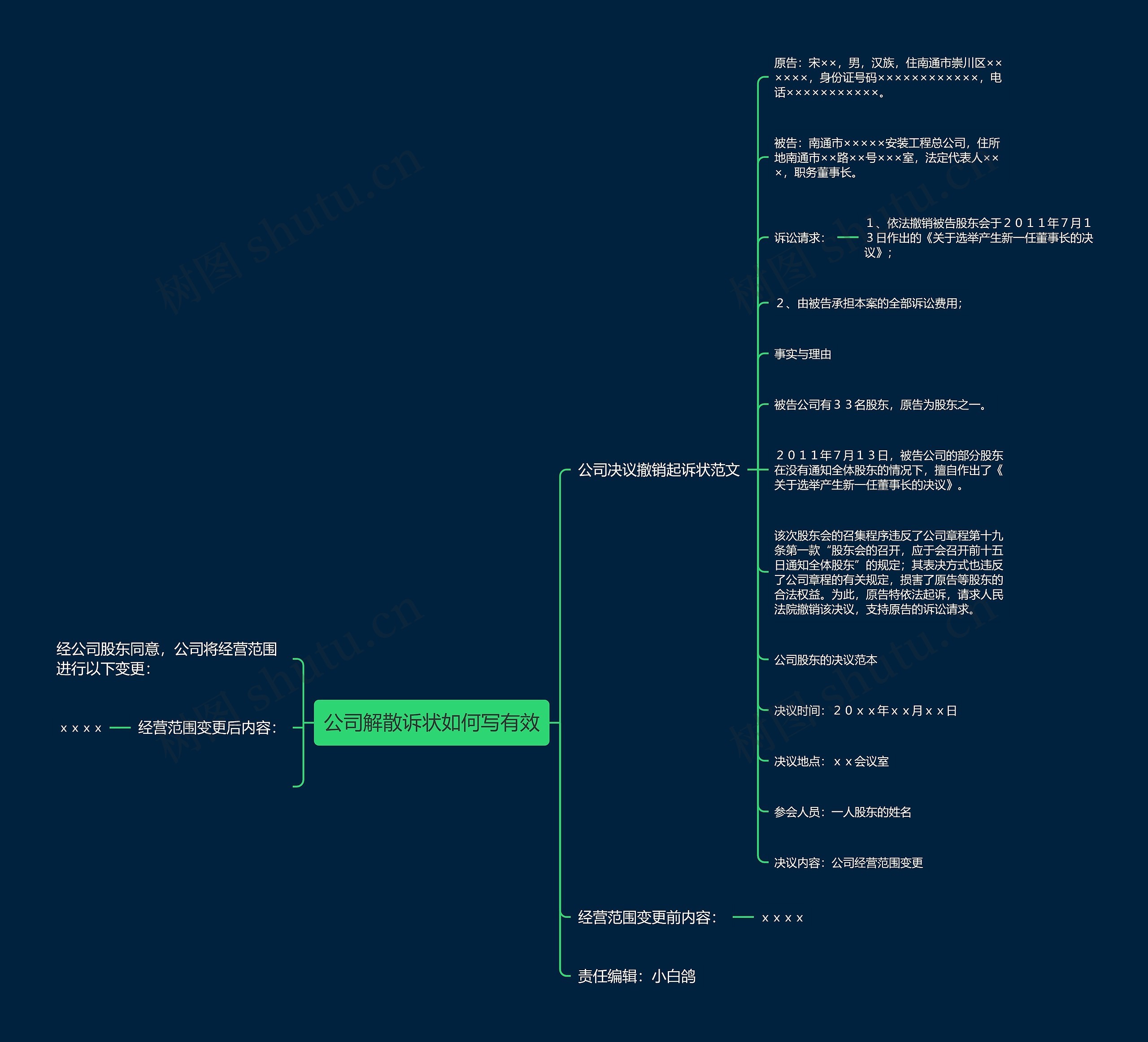树图思维导图提供《公司解散诉状如何写有效》在线思维导图免费制作,点击“编辑”按钮,可对《公司解散诉状如何写有效》进行在线思维导图编辑,本思维导图属于思维导图模板主题,文件编号是:8409fc5fd6113f3b0e42d99311206773