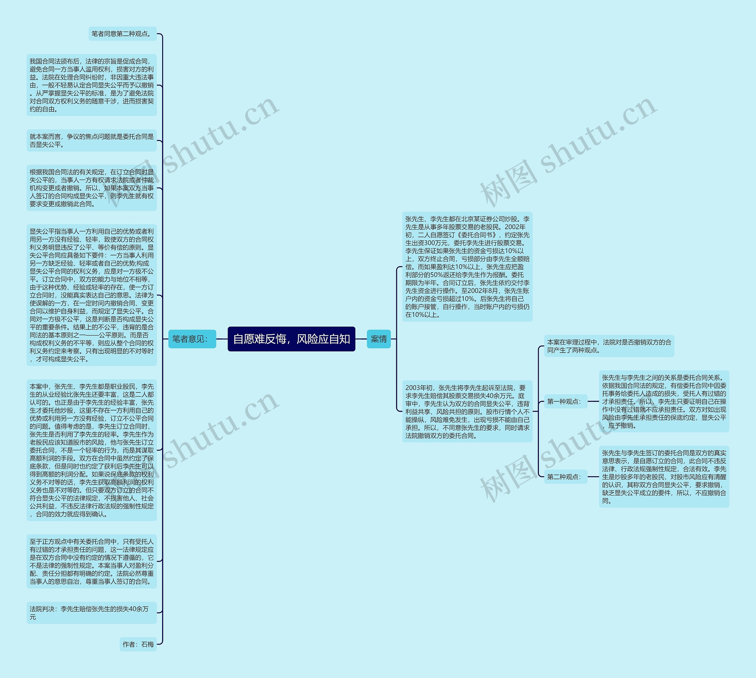 本案中,张先生、李先生都是职业股民,李先生的从业经验比张先生还要丰富,这是二人都认可的。也正是由于李先生的经验丰富,张先生才委托他炒股,这里不存在一方利用自己的优势或利用另一方没有经验,订立不公平合同的问题。值得考虑的是,李先生订立合同时,张先生是否利用了李先生的轻率。李先生作为老股民应该知道股市的风险,他与张先生订立委托合同,不是一个轻率的行为,而是其谋取高额利润的手段。双方在合同中虽然约定了保底条款,但是同时也约定了获利后李先生可以得到高额的利润分配。如果说保底条款的权利义务不对等的话,李先生获取高额利润的权利义务也是不对等的。但只要双方订立的合同不符合显失公平的法律规定,不损害他人、社会公共利益,不违反法律行政法规的强制性规定,合同的效力就应得到确认。