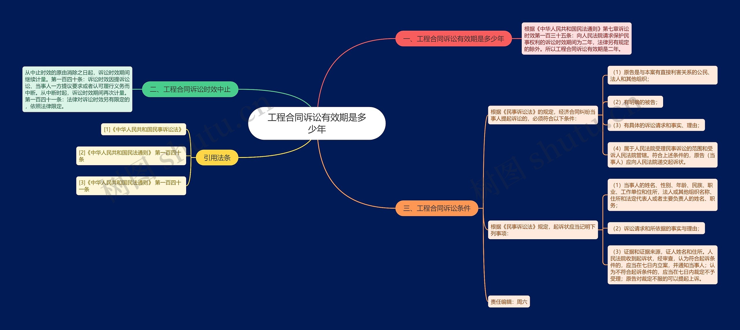 树图思维导图提供《工程合同诉讼有效期是多少年》在线思维导图免费制作,点击“编辑”按钮,可对《工程合同诉讼有效期是多少年》进行在线思维导图编辑,本思维导图属于思维导图模板主题,文件编号是:296d124823cee25c57d7824735299a05