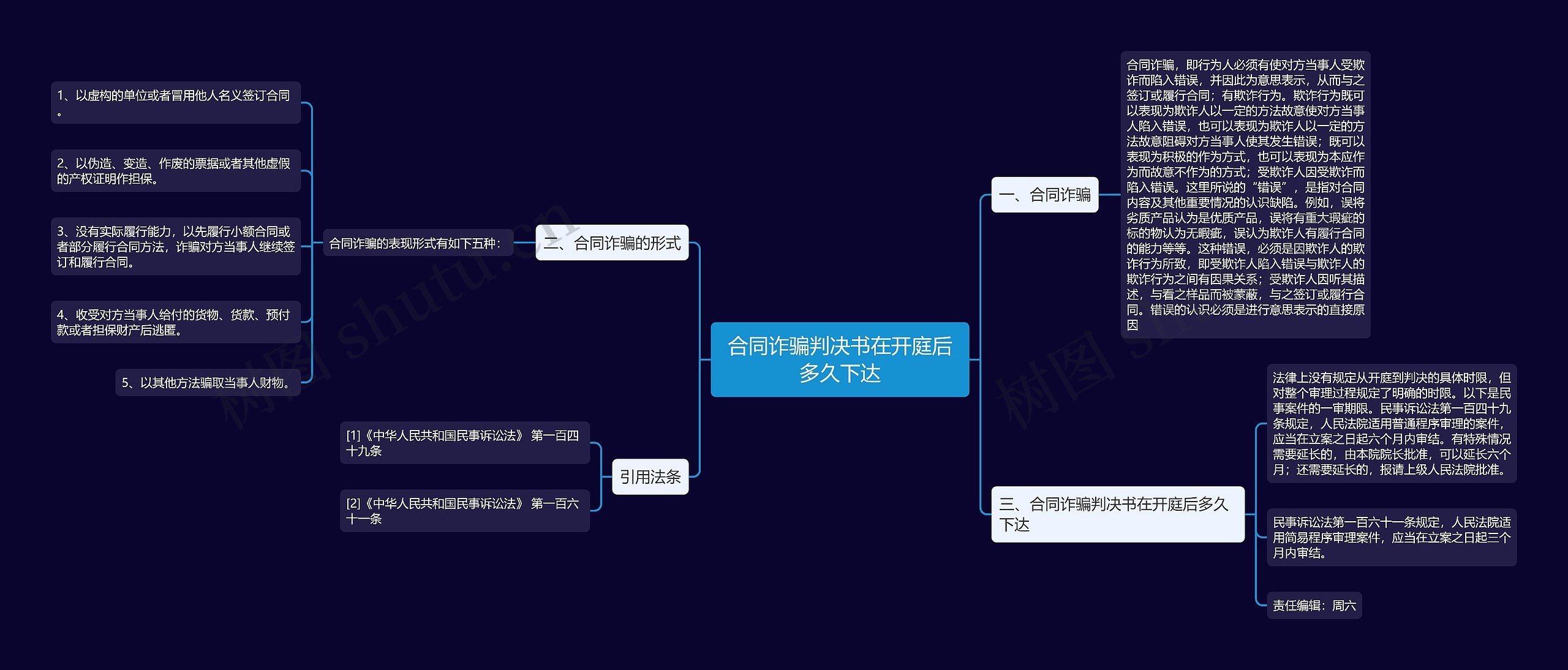树图思维导图提供《合同诈骗判决书在开庭后多久下达》在线思维导图免费制作,点击“编辑”按钮,可对《合同诈骗判决书在开庭后多久下达》进行在线思维导图编辑,本思维导图属于思维导图模板主题,文件编号是:8fcf54c97ce8593cac84514c8bb31cdd