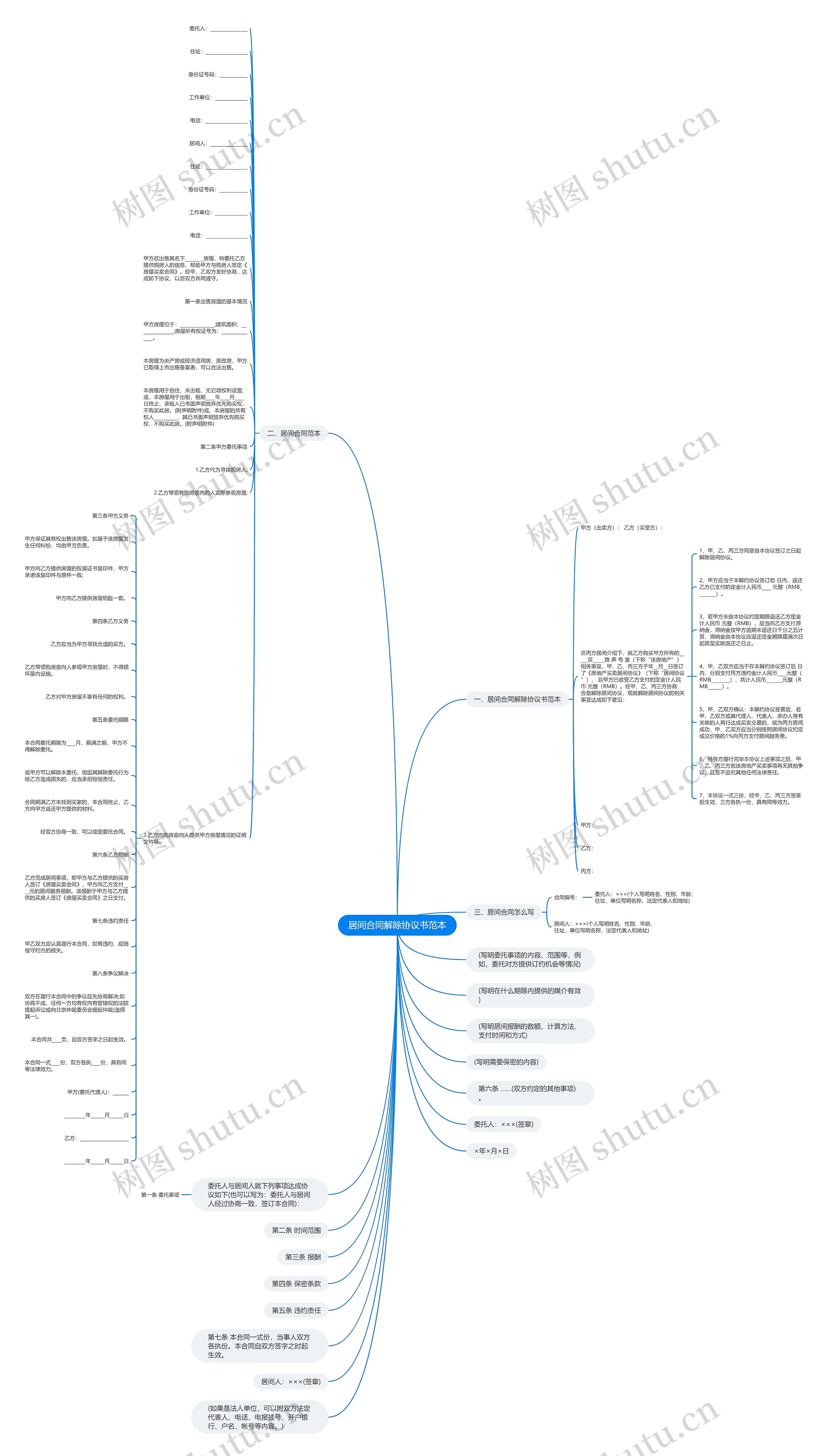 树图思维导图提供《居间合同解除协议书范本》在线思维导图免费制作,点击“编辑”按钮,可对《居间合同解除协议书范本》进行在线思维导图编辑,本思维导图属于思维导图模板主题,文件编号是:6f8ad1f51657171744b213f022c5da0f