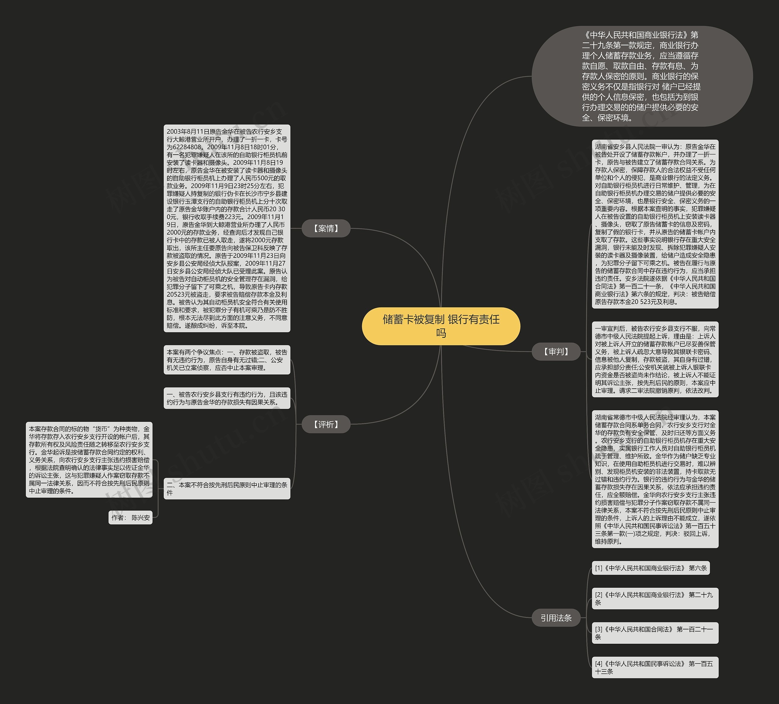 湖南省安乡县人民法院一审认为:原告金华在被告处开设了储蓄存款帐户,并办理了一折一卡,原告与被告建立了储蓄存款合同关系。为存款人保密,保障存款人的合法权益不受任何单位和个人的侵犯,是商业银行的法定义务。对自助银行柜员机进行日常维护、管理,为在自助银行柜员机办理交易的储户提供必要的安全、保密环境,也是银行安全、保密义务的一项重要内容。根据本案查明的事实,犯罪嫌疑人在被告设置的自助银行柜员机上安装读卡器、摄像头,窃取了原告储蓄卡的信息及密码,复制了假的银行卡,并从原告的储蓄卡帐户内支取了存款。这些事实说明银行存在重大安全漏洞,银行未能及时发现、拆除犯罪嫌疑人安装的读卡器及摄像装置,给储户造成安全隐患,为犯罪分子留下可乘之机。被告在履行与原告的储蓄存款合同中存在违约行为,应当承担违约责任。安乡法院遂依据《中华人民共和国合同法》第一百二十一条,《中华人民共和国商业银行法》第六条的规定,判决:被告赔偿原告存款本金20 523元及利息。