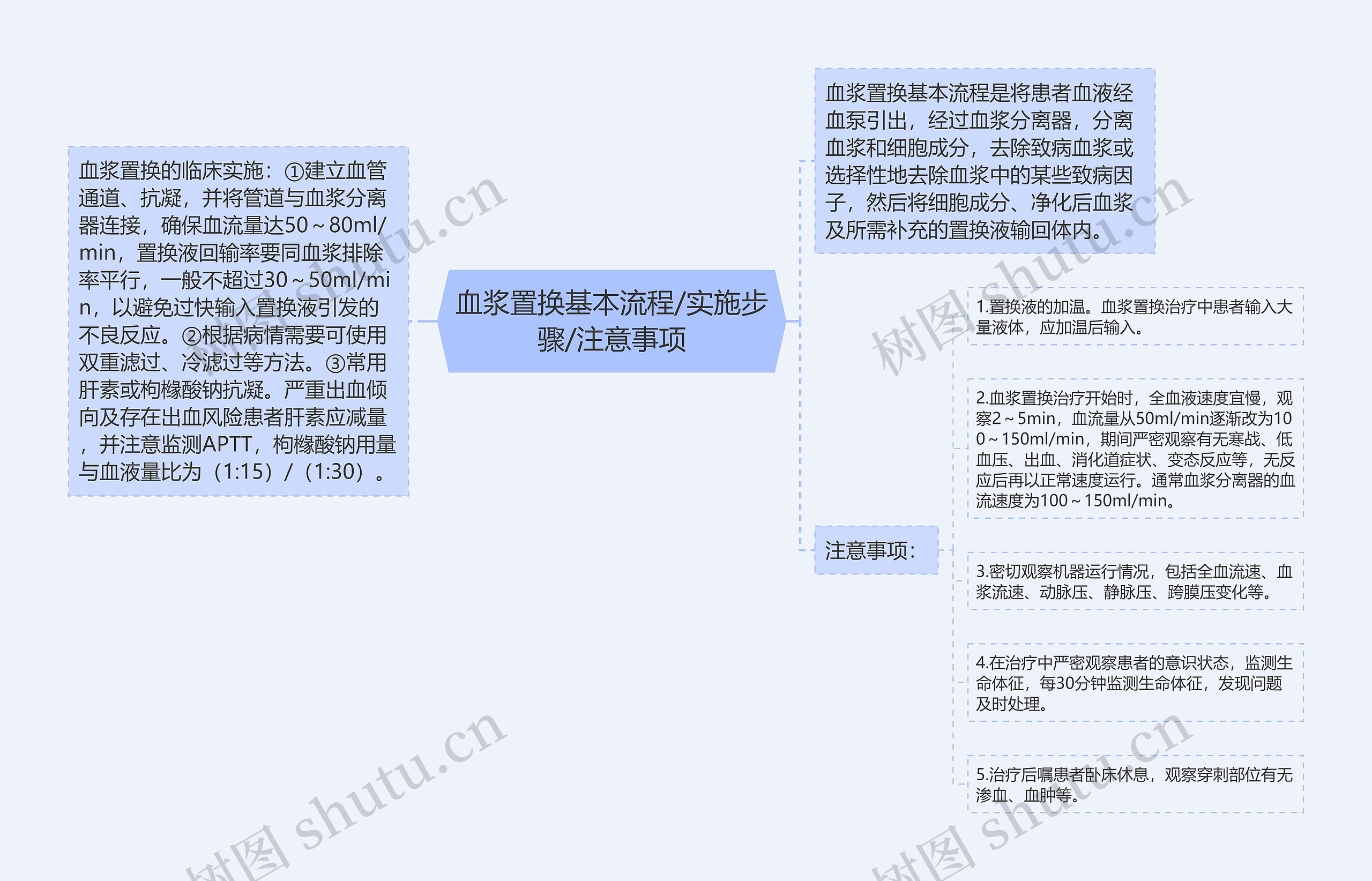 关于“血浆置换基本流程/实施步骤/注意事项”概述,相信很多人都很感兴趣,树图思维导图编辑就该知识点为大家整理如下:血浆置换基本流程是将患者血液经血泵引出,经过血浆分离器,分离血浆和细胞成分,去除致病血浆或选择性地去除血浆中的某些致病因子,然后将细胞成分、净化后血浆及所需补充的置换液输回体内。