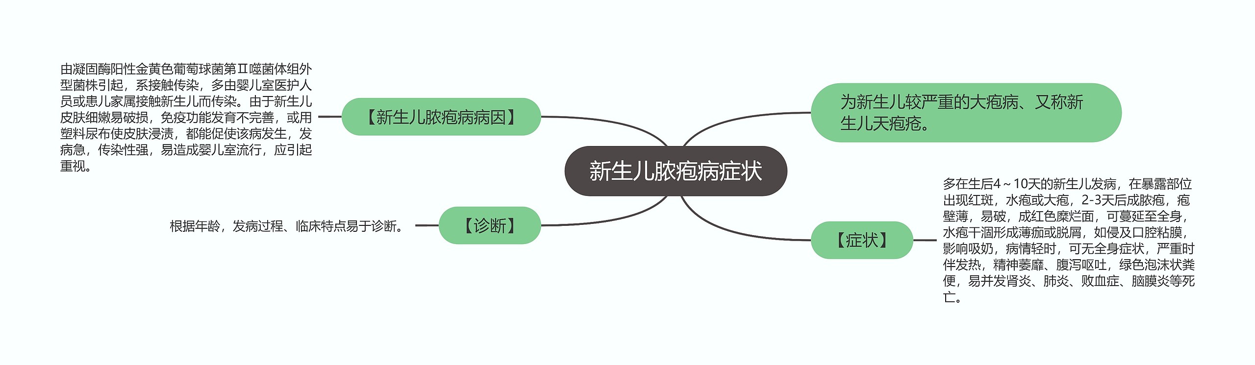 树图思维导图提供《新生儿脓疱病症状》在线思维导图免费制作,点击“编辑”按钮,可对《新生儿脓疱病症状》进行在线思维导图编辑,本思维导图属于思维导图模板主题,文件编号是:07a9a4901c40cc63c1ff65d28c6fe894