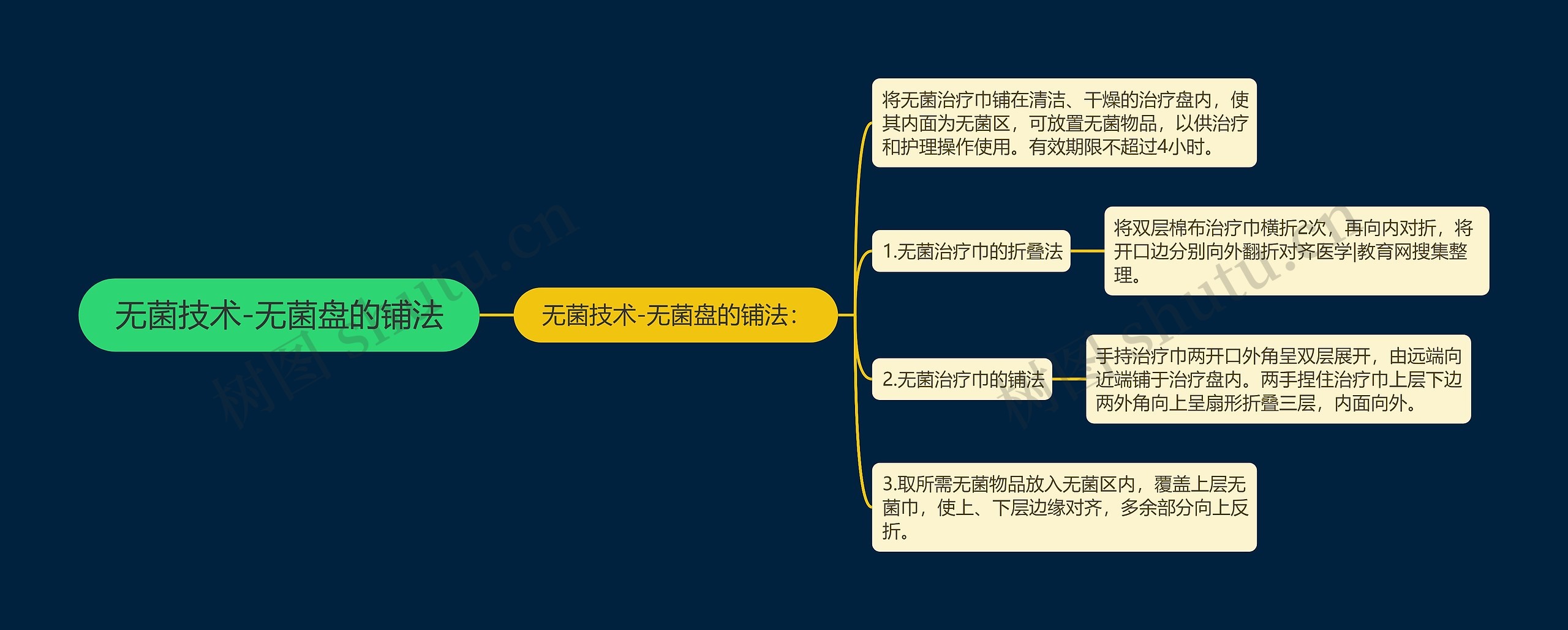 树图思维导图提供《无菌技术-无菌盘的铺法》在线思维导图免费制作,点击“编辑”按钮,可对《无菌技术-无菌盘的铺法》进行在线思维导图编辑,本思维导图属于思维导图模板主题,文件编号是:5191ca0050afeaaedff3c71c21c742ef