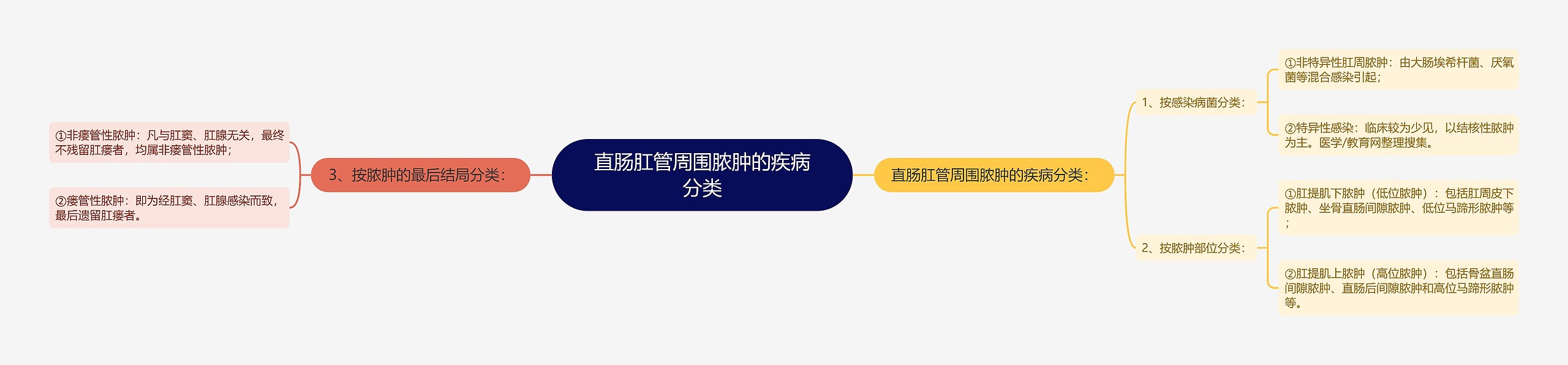 直肠肛管周围脓肿的疾病分类: 1、按感染病菌分类: ①非特异性肛周脓肿:由大肠埃希杆菌、厌氧菌等混合感染引起; ②特异性感染:临床较为少见,以结核性脓肿为主。医学/教育网整理搜集。