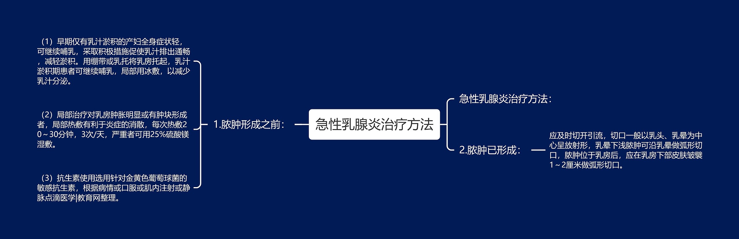 急性乳腺炎治疗方法: 1.脓肿形成之前: (1)早期仅有乳汁淤积的产妇全身症状轻,可继续哺乳,采取积极措施促使乳汁排出通畅,减轻淤积。用绷带或乳托将乳房托起,乳汁淤积期患者可继续哺乳,局部用冰敷,以减少乳汁分泌。