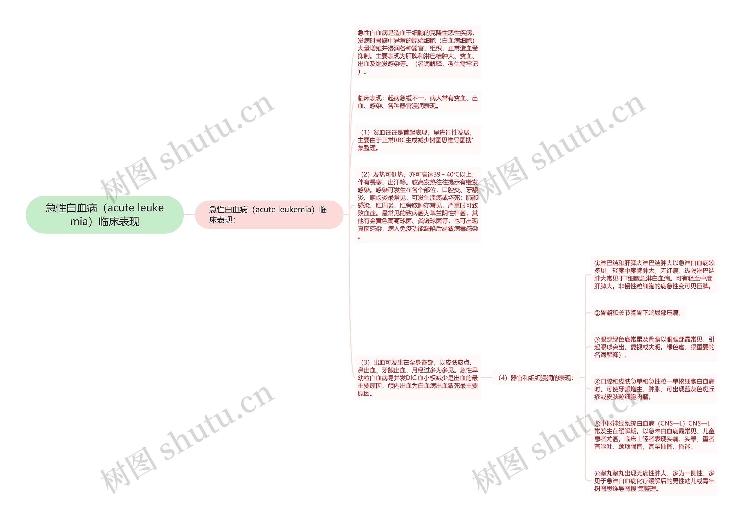 临床表现:起病急缓不一,病人常有贫血、出血、感染、各种器官浸润表现。