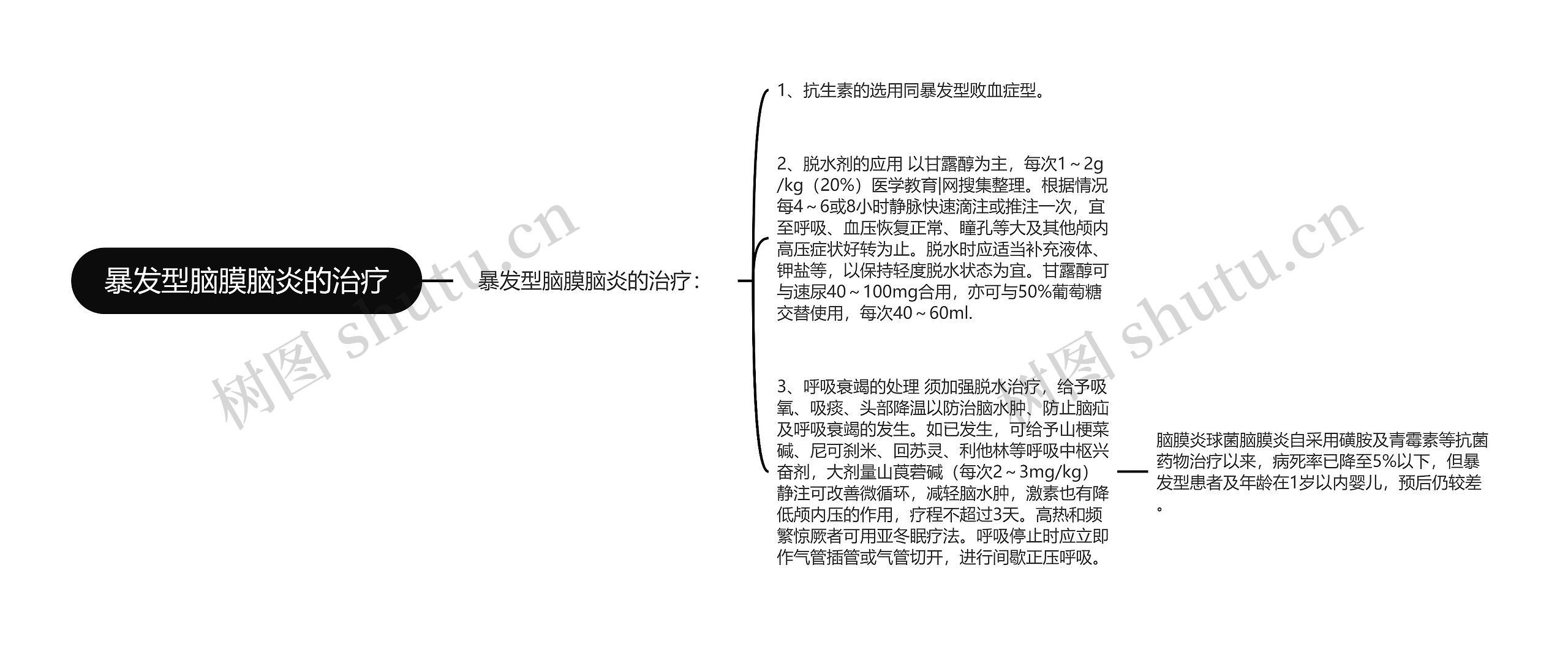 树图思维导图提供《暴发型脑膜脑炎的治疗》在线思维导图免费制作,点击“编辑”按钮,可对《暴发型脑膜脑炎的治疗》进行在线思维导图编辑,本思维导图属于思维导图模板主题,文件编号是:e4d7e772f8a4f881760e4ff304bf4b50